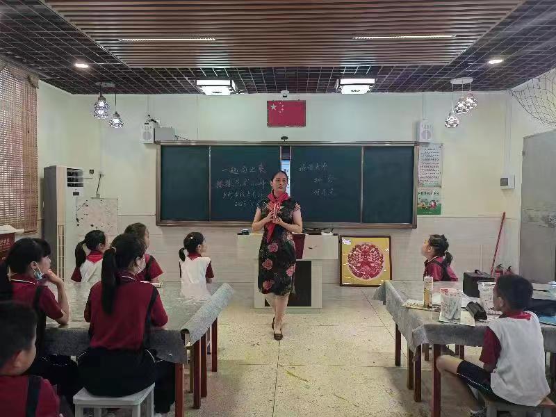 何丹凤采用独特的脱稿剪纸教学方法,向学生展示传统剪纸技艺,同时讲述剪纸艺术悠久的历史传承。孩子们在现场剪牡丹花、大公鸡、如意等祥瑞图案,感受传统剪纸的魅力。