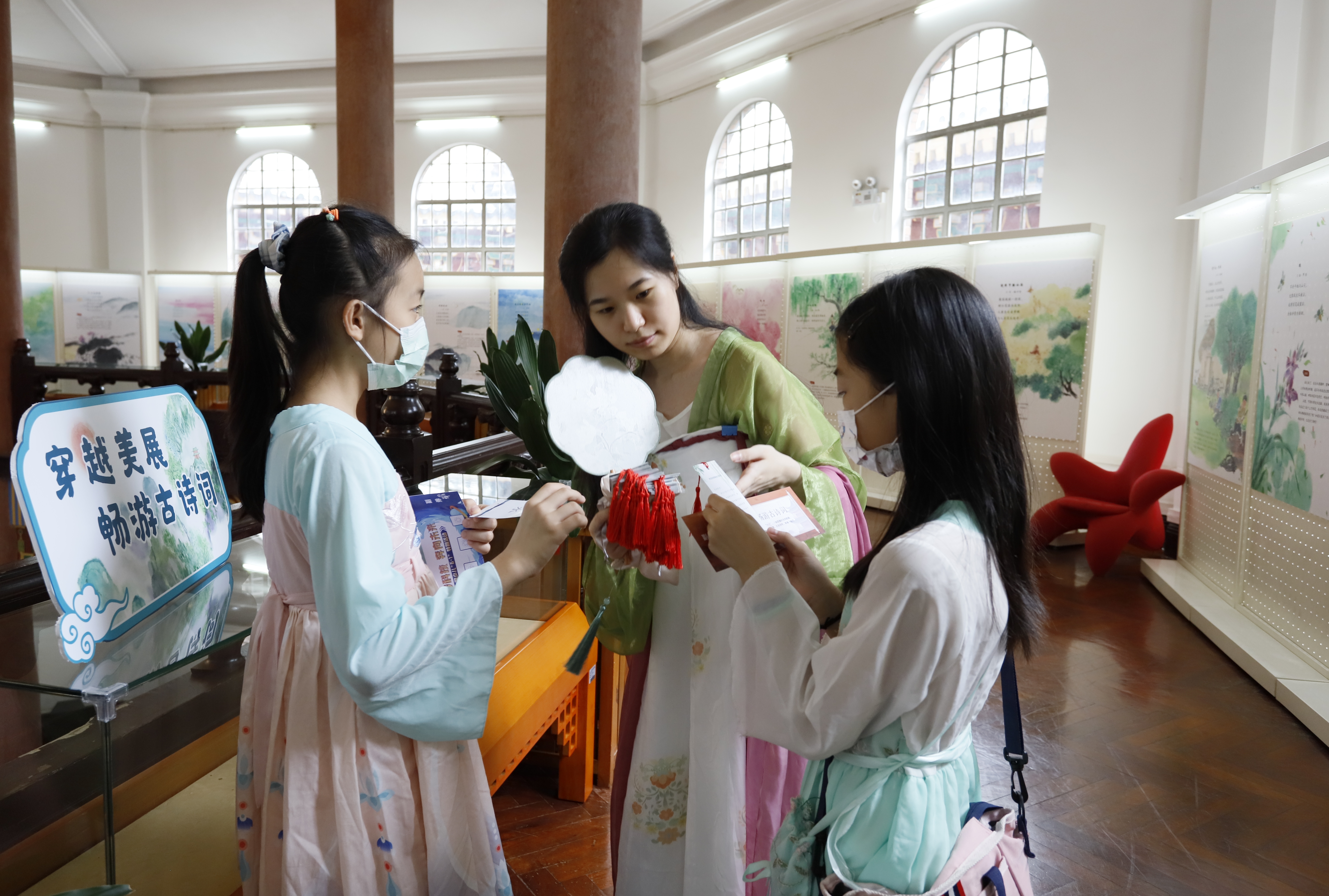 飞檐斗拱处,雕梁画栋间,古色古香的建筑环境为“古诗词里的山水童真”展览更添一抹流动的诗意。韵拈风絮,录成金石,赏读经典诗词古文之余,小读者们还能与披帛曳地、执扇而立的“画中仕女”同玩飞花令、诗词问答等互动游戏,穿越古今,身临其境体验文人墨客斗诗之乐。