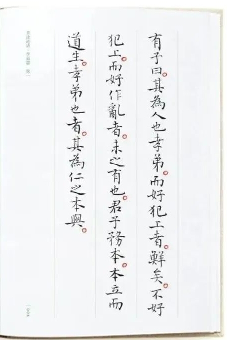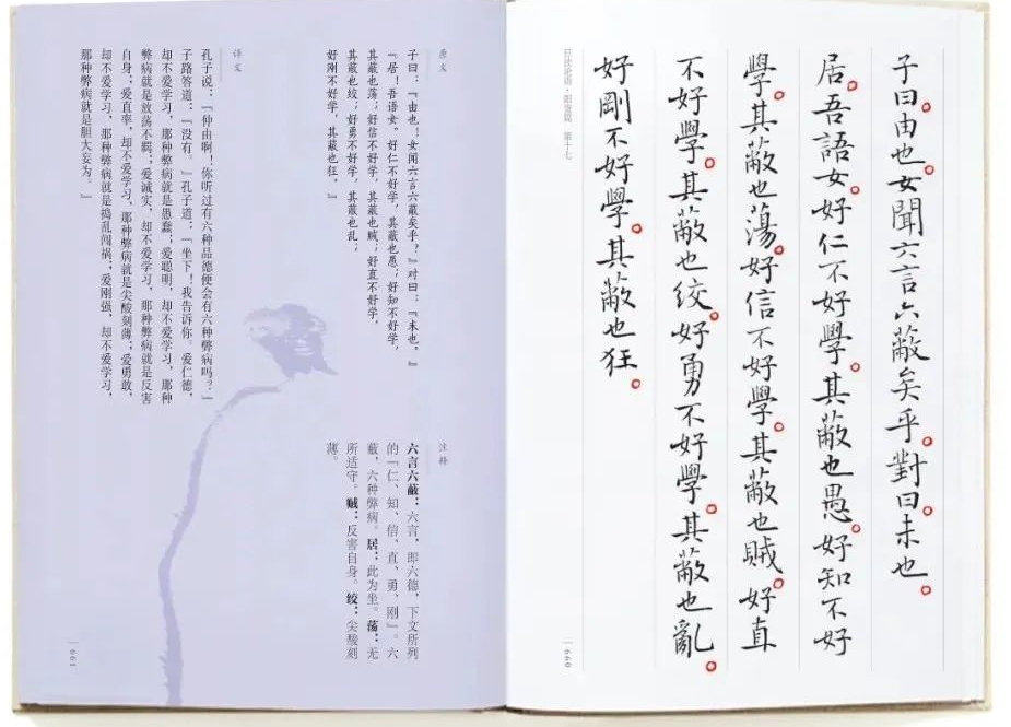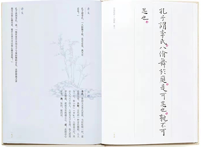首先这本书独到之处是书法名家孙晓云小楷抄写《论语》原典,并原图影印,版面设计讲究古典竖排,自右向左中式翻阅,这样非常符合中国传统书写及阅读的方式。整本书在色彩上既古朴典雅,又清新可人,全书五种底色,象征日月更替的色彩心情,同时配有古代绘画图案,隐隐绰绰,意境幽雅。封面及开本设计注重简约时尚,既有传统元素的宁静与高贵,又有现代感的抽象与轻松。整本书放在桌上可完全展平,捧在手里是柔软可亲的,扑面而来的是一股醇厚的书卷气和清新感。其开本非常便于携带和放于案头阅读。
