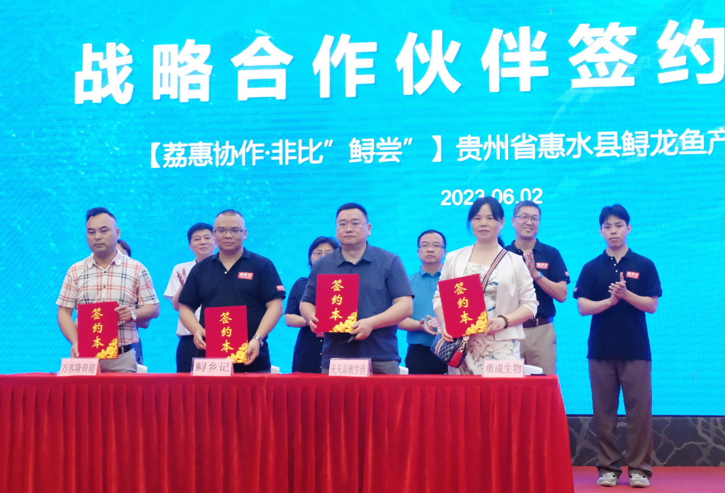 此次活动对外发布“鲟乡记”品牌6项鲟鱼系列产品,包括鲟鱼鱼丸、鱼饼、水饺、香肠、辣椒酱、面条等,迎合粤港澳大湾区群众的口味。现场, “鲟乡记”品牌与番禺供销社、白云供销社、荔湾供销社,万客隆,天天品致生活,贵州电商云、云贵农业、无界甄选(广州)国际商贸中心等多家企业签署战略互合作协议,为惠水鲟鱼“游”进大湾区,进一步提供了坚实可靠的力量。