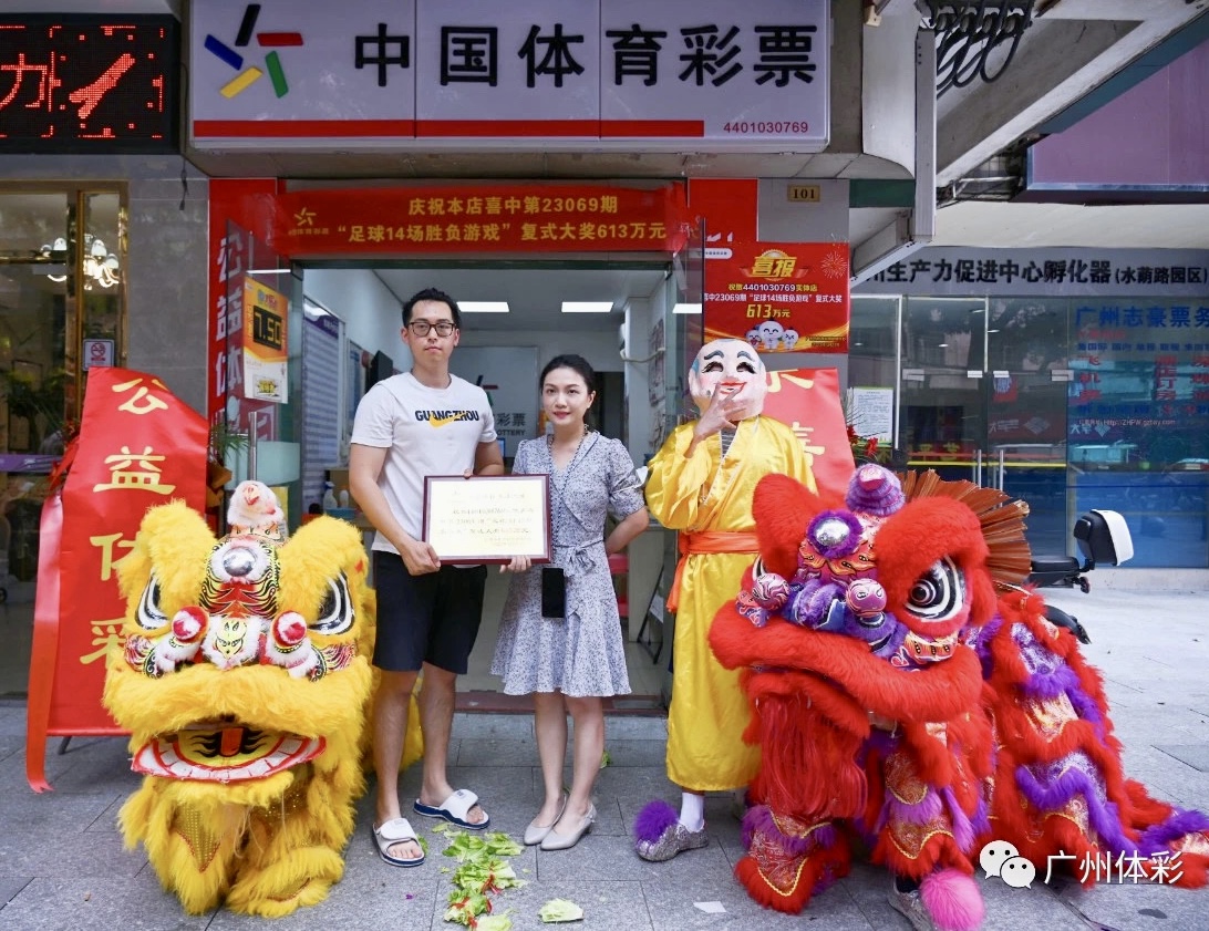 6月2日,位于广州越秀区水荫路的4401030769实体店门前锣鼓喧天,醒狮起舞,鲜艳的横幅、喜报,娇嫩的鲜花把店面装点得喜气洋洋,附近居民纷纷驻足观看。原来,这是广州体彩为刚刚中出足彩大奖的实体店举行简单而隆重的庆祝仪式。