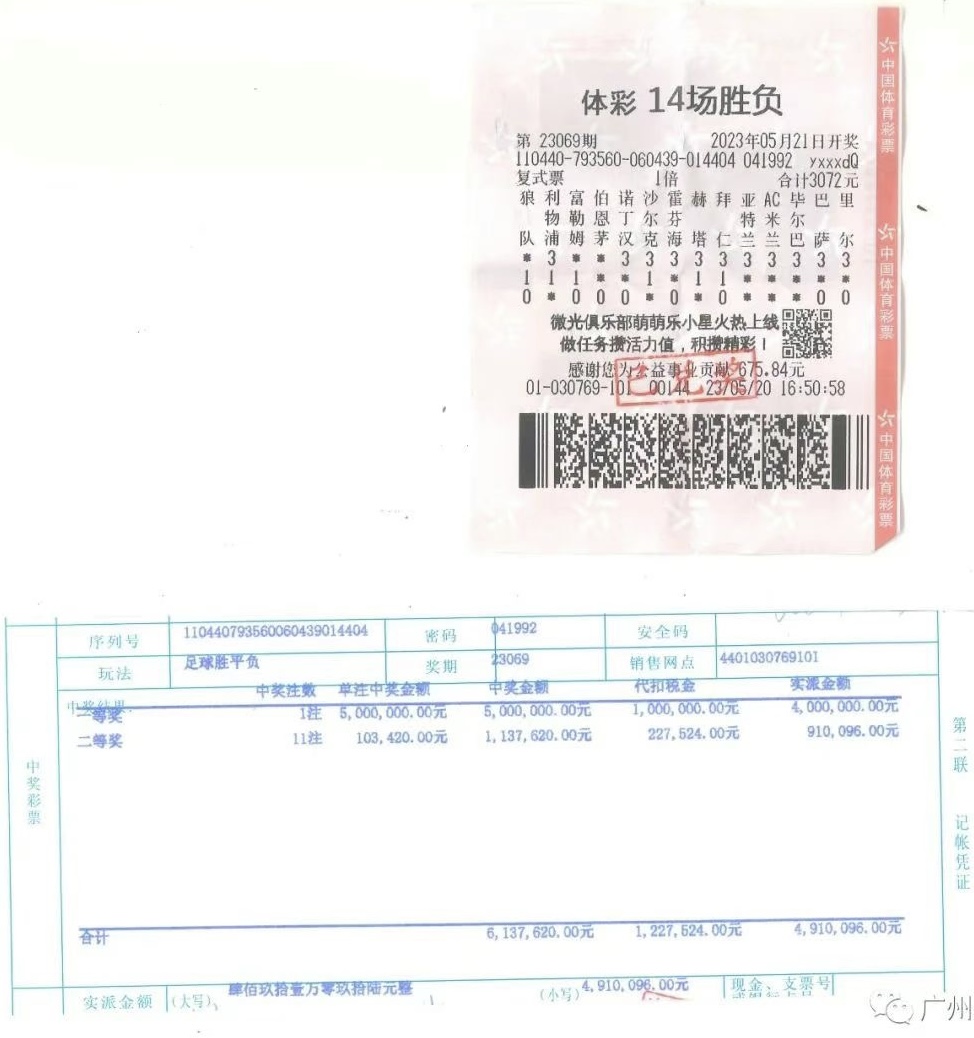 据了解,5月21日开奖的第23069期足球十四场胜负彩以英超、德甲、意甲、西甲和法甲五大联赛为竞猜对象,该期全国中出一等奖2注,每注奖金500万元;二等奖60注,每注奖金10万余元。中奖人邓生(化姓)已于5月22日到广州市体育彩票管理中心兑奖。他购买了一张复式彩票,中得一等奖1注、二等奖11注,总奖金为613万余元,并缴纳个人偶然所得税122万余元。
