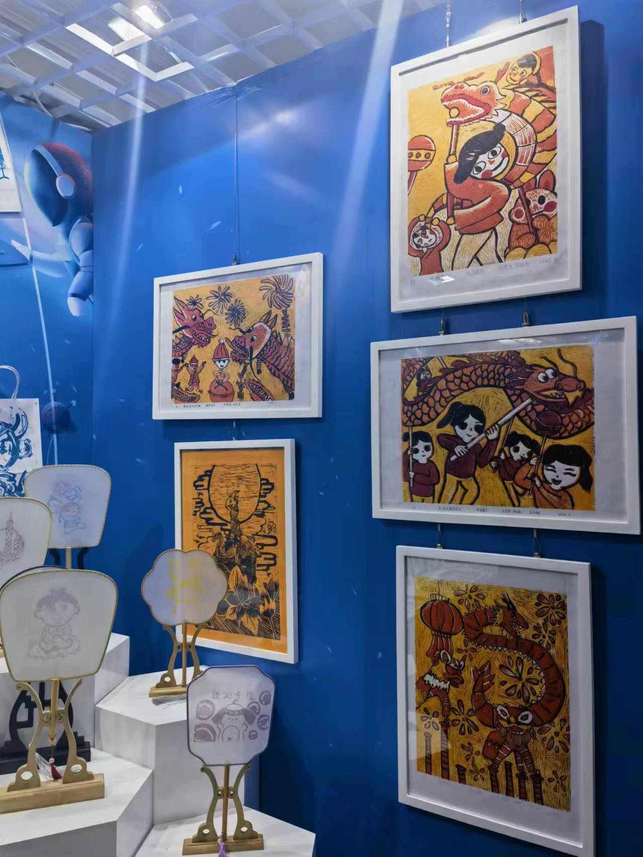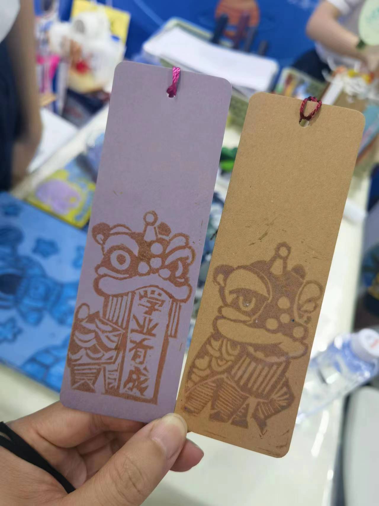 记者现场体验的非遗木刻摊位,自己印制的书签