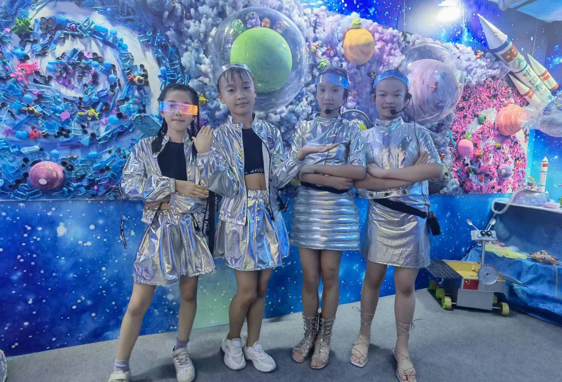 现场具有科技感的摊位,四位身穿未来感服装的小导览员