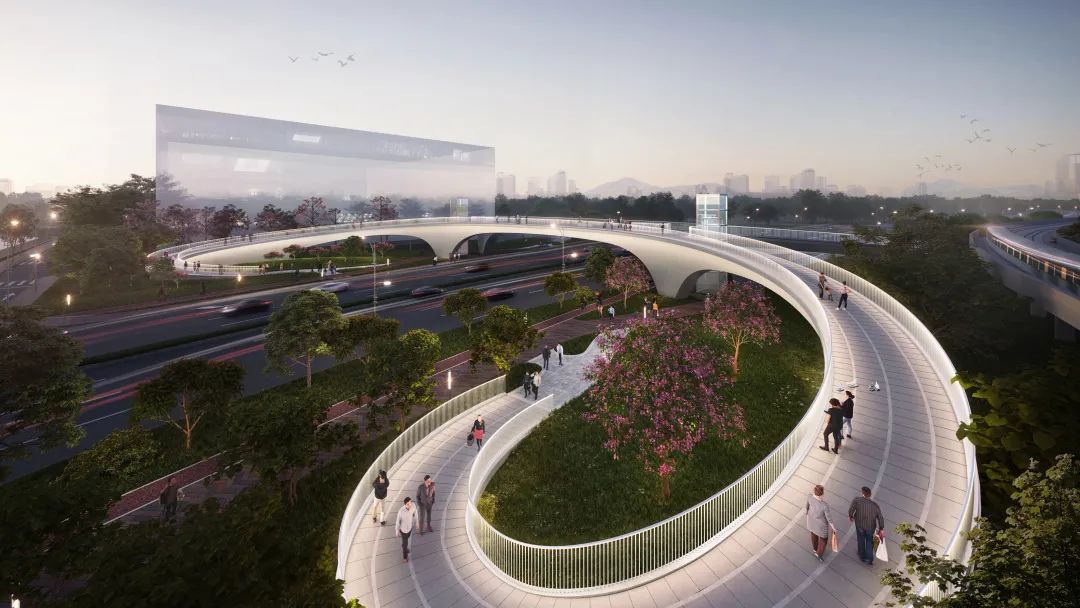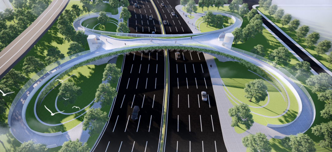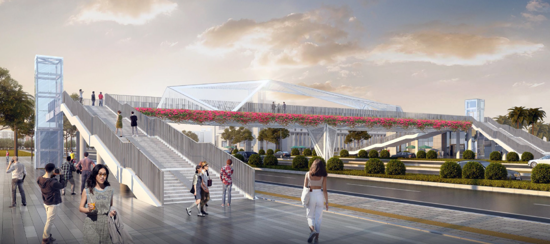 项目设计充分挖掘和突出地方特色,最大程度与城市绿道、步道、周边建筑立面互相结合,以绿色环保理念为主题,将广州花城花道及广州羊城的理念融入到桥体设计中,与自然生态结合,使桥体赋予了独特性与标识性,创造一个独特的桥上空间,打造一座充满活力的“空中绿廊,花园步道”,使景观天桥成为凤凰大道上一道惬意的风景,与周边环境完美融合。