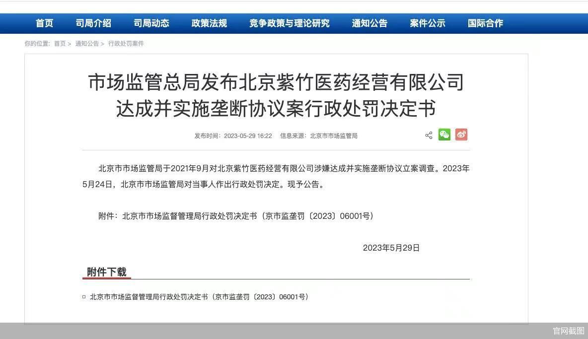 消息称,北京市市场监管局于2021年9月对北京紫竹涉嫌达成并实施垄断协议立案调查。2023年5月24日,北京市市场监管局对北京紫竹做出行政处罚决定。北京市市场监管局对北京紫竹处以其2020年度销售额2%的罚款,共计1264.36万元人。