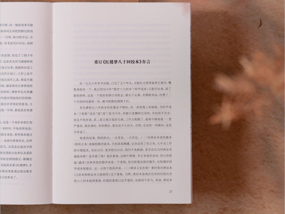在底本以外,这套书还参考了许多版本,如:甲戌本(乾隆甲戌脂砚斋重评《石头记》,简称“甲”)、己卯本(乾隆己卯四阅评本脂砚斋重评《石头记》,简称“己”)、庚辰本(乾隆庚辰四阅评本脂砚斋重评《石头记》,简称“庚”)、蒙藏本(蒙古王府藏《石头记》,简称“蒙”)、靖藏本(杨州靖氏藏《石头记》,简称“靖”)、列藏本(列宁格勒东方学研究所藏《石头记》,简称“列”)、甲辰本(乾隆甲辰梦觉主人序《红楼梦》,发现于山西,简称“晋”)、杨藏本(杨继振藏《红楼梦》,简称“杨”)可以看到,这套书编校用心,内容精良,是不可多得的《红楼梦》版本。