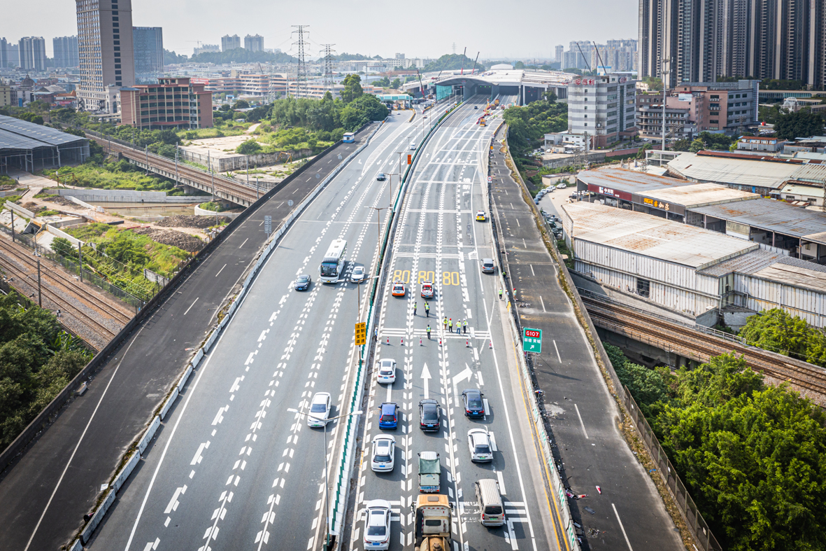 “主线车流已控制,现在开始交通转换!”9点整,随着交警下达指挥命令,现场呈现出一片忙碌有序的情景:工作人员或搬动水马,或调整防撞栏,或打开封闭设施,或有序撤离……用时仅8分钟,在高速交警车辆的带领下,转换段车流整体转换至南行深圳方向内侧主线桥通行,一路畅通无阻。