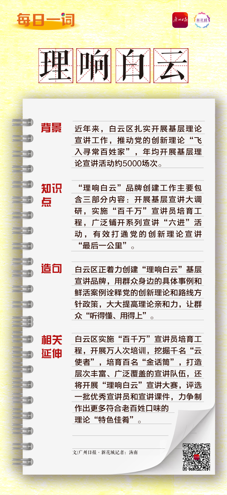 “理响白云”是广州市白云区着力创建的理论宣讲品牌,寓意“让党的创新理论响彻白云大地”,通过深入开展调研,加强宣讲员挖掘培训,全面铺开宣讲“六进”活动,为广东、广州高质量发展提供白云精神支撑。