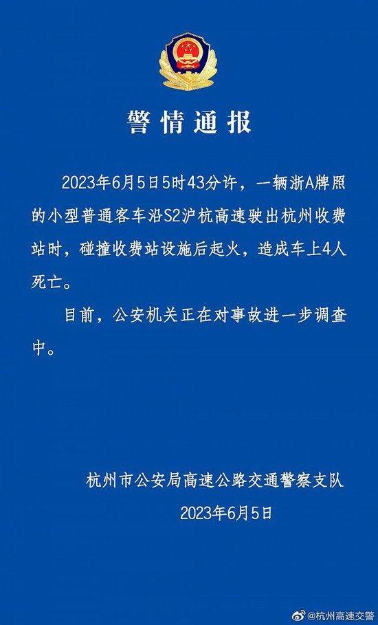 @杭州高速交警 6月5日通报,6月5日5时43分许,一小型普通客车沿S2沪杭高速驶出杭州收费站时,碰撞收费站设施后起火,造成车上4人死亡。目前,公安机关正在对事故进一步调查中。