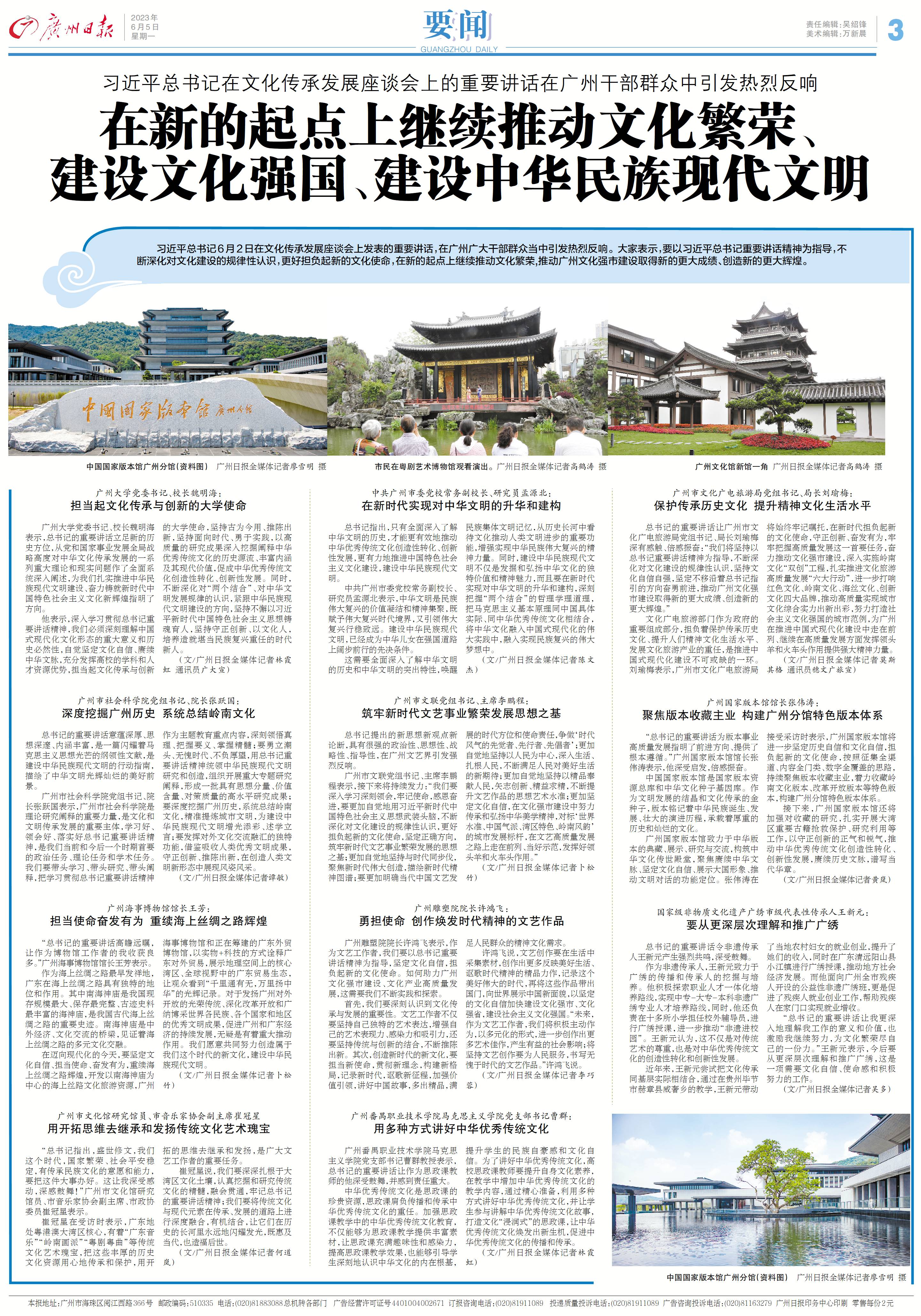 习近平总书记6月2日在文化传承发展座谈会上发表的重要讲话,在广州广大干部群众当中引发热烈反响。大家表示,要以习近平总书记重要讲话精神为指导,不断深化对文化建设的规律性认识,更好担负起新的文化使命,在新的起点上继续推动文化繁荣,推动广州文化强市建设取得新的更大成绩、创造新的更大辉煌。