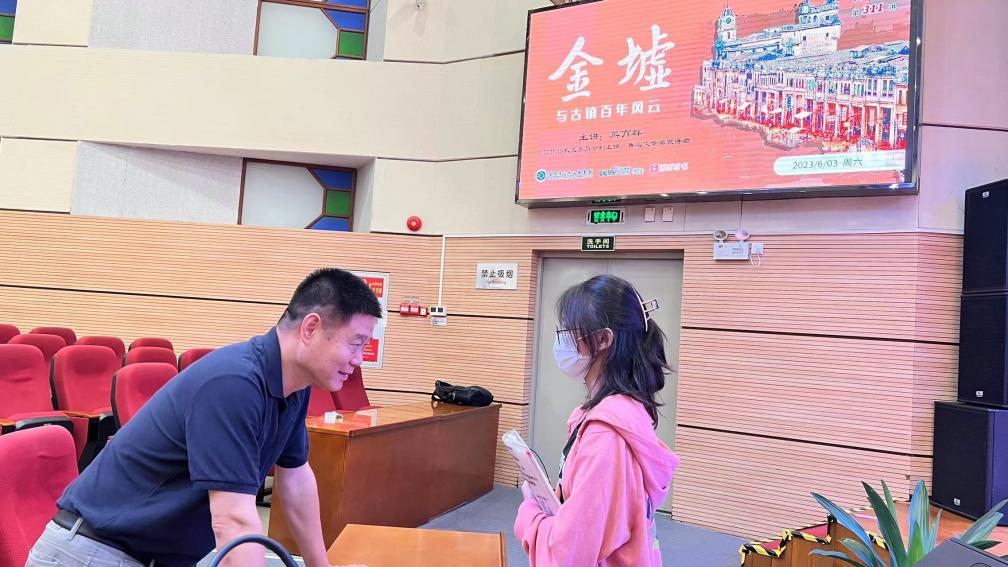 讲座中,熊育群还谈到了他文学创作的体验和思考,为观众介绍了小说的双线叙事结构,并在分享中穿插进自己采风时遇到的乡土趣事,其风趣幽默的讲述引发了现场观众时不时地会心一笑。在读者互动环节,关于《金墟》和写作的提问一个接一个,熊育群都一一进行了解答和交流。更有热情的年轻读者在讲座之后仍旧依依不舍,特意上前向作家请教小说与文学创作等问题,熊育群十分耐心地做了详细解答,并为小读者送上了诚挚的鼓励。