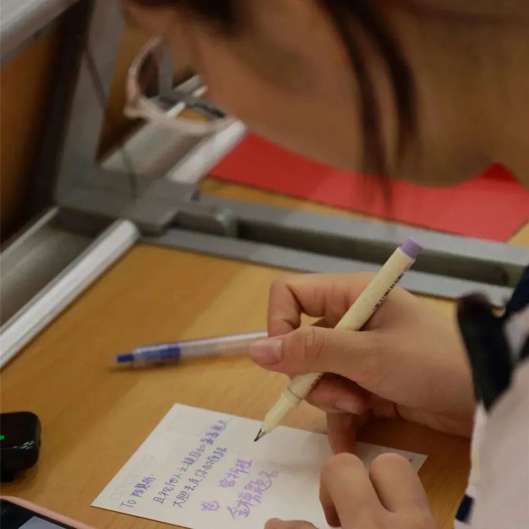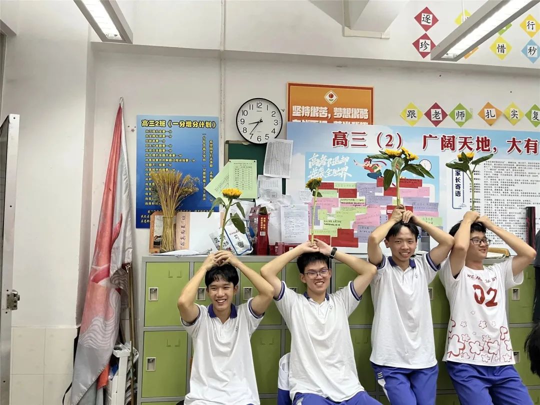 在考前,家长还为孩子们送上了向日葵,希望大家都能“一举夺魁”;高二的学弟学妹们亲手折了千纸鹤送给高三的学生,祝福他们旗开得胜,马到成功。