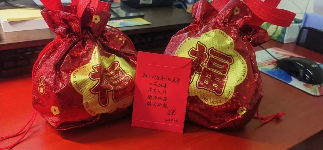 在最后一节晚自习结束后,高三各个班的老师都给学生准备了“最后一个晚修”的纪念小活动。校领导和老师为高三学生送上祝福。校长王勇给各班送上写着“五岳独尊,昂首天外,鹏抟扶摇,蟾宫折桂”的祝福红包,同时,还为每一位同学送上福袋,代表着考试“平安,顺利”,“逢考必过”。