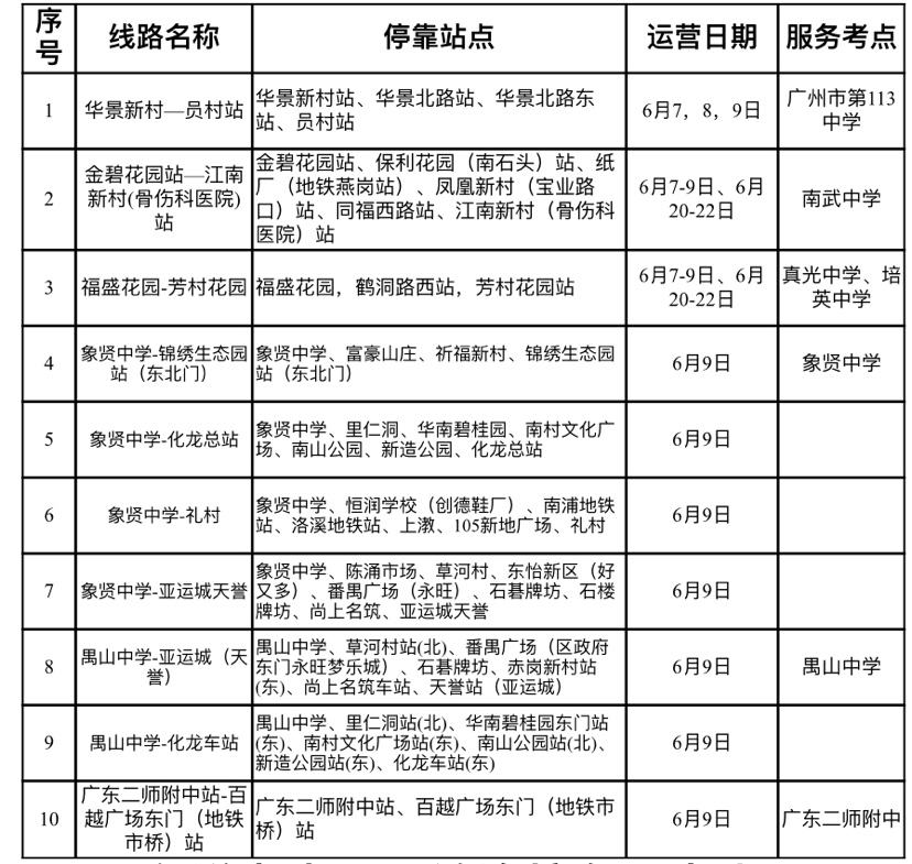 公交方面,广州巴士集团将按照上级主管部门的要求,视交通管制情况,在6月7日至6月9日08:00-18:30时段,执行113线、121线、121A线、243线、527线等39条线路的临时调整安排,包括在相应时段临时取消宝岗大道北站(南行)、同福中路站(东行)、善贤街站(双向)等18个站点。高考期间,安排专人做好南武中学、113中学东方校区等9个考点周边站点现场值守,维护公交站点秩序、引导公交规范操作,避免交通堵塞、随意鸣号情况的发生,并为受临时交通管制取消停靠站点影响的乘客提供导乘服务。同时根据现场环境适时增加车辆的投放和加密趟次,保证考生及陪考家长及时通达和疏散,确保高考期间考点周边现场秩序平稳。