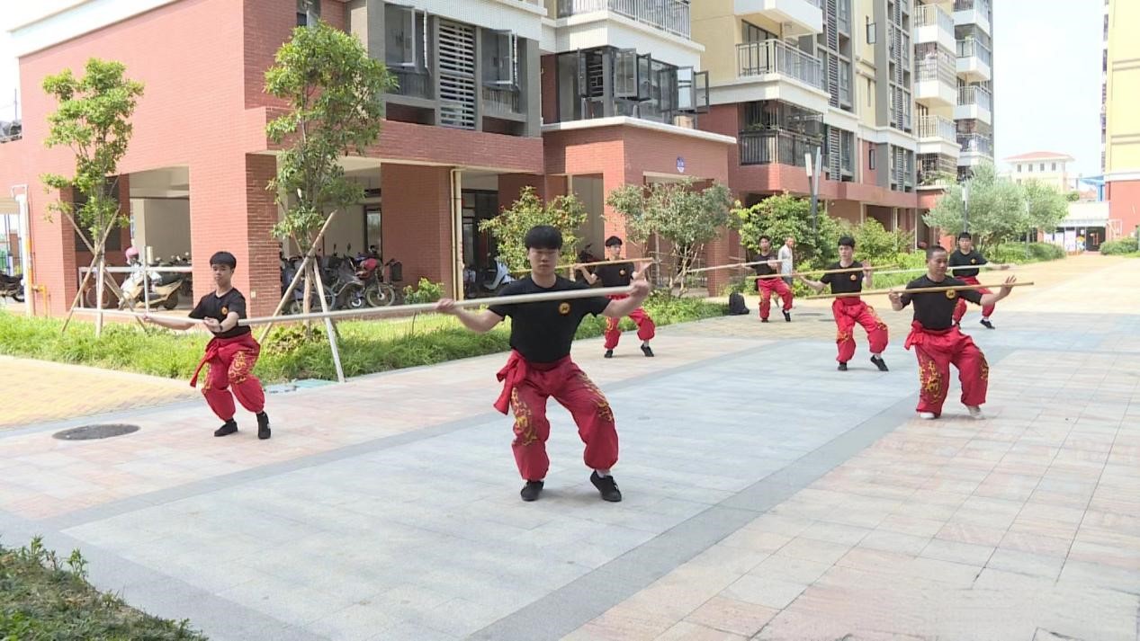 日前,在广州市白云区人和镇机场第三跑道安置区内一个小广场上,一群身穿黑色T恤、红色裤子的青少年正在全力练习拳术和棍术,一招一式间传递出极强的力量感。这群青少年来自汉塘村,年龄大的二十多岁,小的还是小学生。他们练习的武术叫“班中少林”,在汉塘村已有130多年的历史,群众基础广泛。去年,这门武术被列为白云区非物质文化遗产。