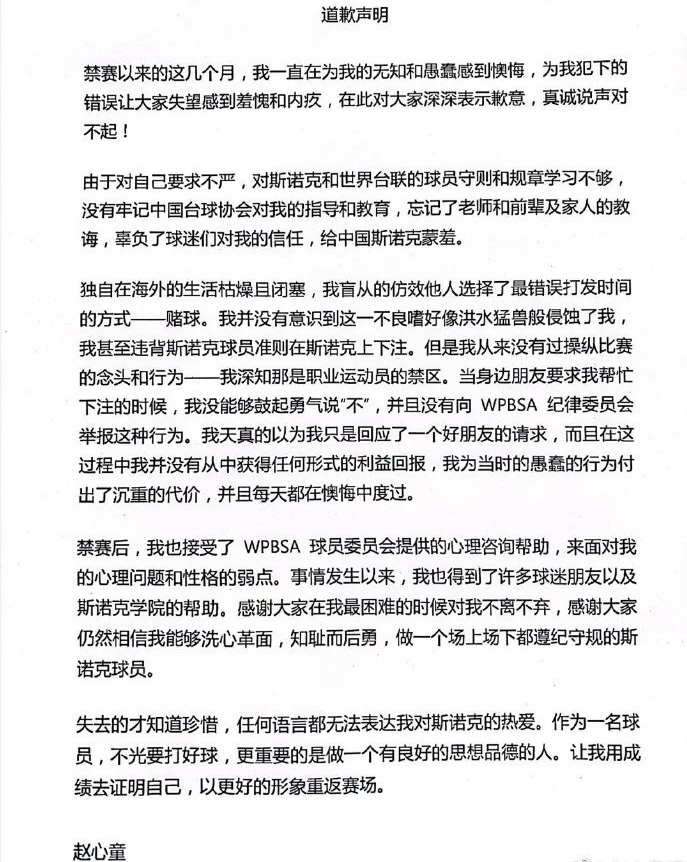 6月7日凌晨,在处罚结果公布后,赵心童立即发布《道歉声明》,向大家真诚说对不起。赵心童承认他对自己要求不严,对球员守则和规章学习不够,辜负了球迷的信任,让中国斯诺克蒙羞。