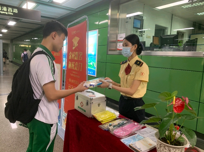 广州地铁团委为满足考生赴考可能出现的不时之需,在12个邻近考点的重点站设置了“爱心助考驿站”,配备爱心文具袋、爱心药箱、一次性雨衣等便民物资,供考生免费领取使用;此外,开展线上高考许愿接力活动,发动广大市民参与线上互动,送出对自己或考生的祝福,线下车站也开设了“心愿墙”,供来往乘客为考生打卡加油。