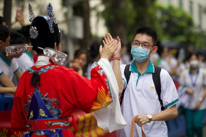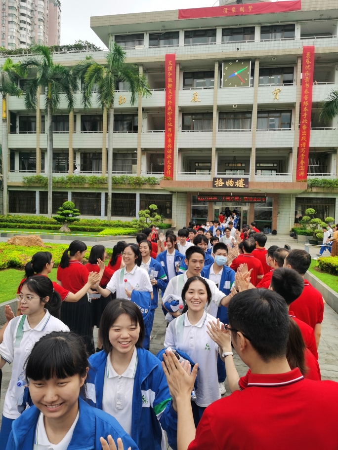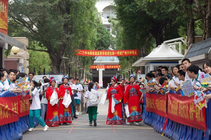 在华南师范大学附属中学(以下简称“华附”)考点,不少家长送完孩子入考场后,仍站在校门口的天桥上等待开考铃声响起。陈女士身着特意为送考准备的红色旗袍,她的孩子是华附首届强基班的学生,考前这几天,她最关注如何舒缓孩子情绪,“虽然我比他还紧张,但我要表现得更淡定。我们班里几位妈妈已经相约轮流在家展示厨艺,让孩子们吃上最爱吃的饭菜,我儿子喜欢吃西蓝花炒牛肉、可乐鸡翅,寓意锦上添花、大鹏展翅。”