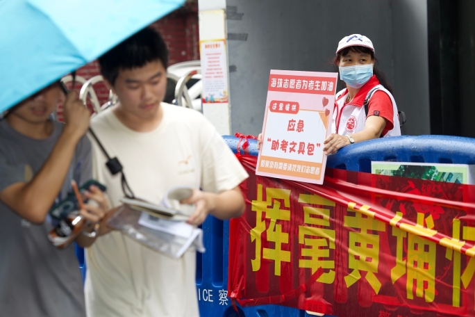 考点外,高举向日葵、香蕉、粽子、甘蔗,取“一举夺魁(葵)”“今朝(蕉)高中(粽)”“掂过碌蔗”等好意头,已成了家长送考的常规操作。除了家长,身着“状元服”的学弟学妹、特意向幼儿园告假来送考的妹妹也让人倍感温暖。这些花式应援让高考现场少了一些紧张,多了几分欢乐。