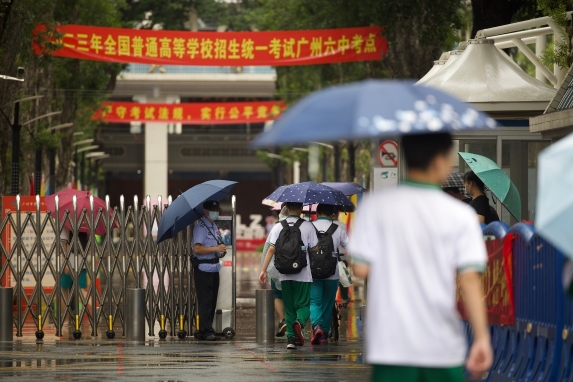 在广州市第六中学考点,走出考场的考生普遍反映数学题目比平时训练的更简单,但大题题目顺序有变,属于意料之外。广州市育才中学考生说,自己是语文课代表,他觉得今年的作文题目比较常规,自己用上了神舟十五号航天员邓清明、神舟十六号航天员桂海潮的经历作为素材,“我想预计作文可以拿61分。”他打趣道。