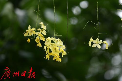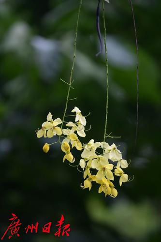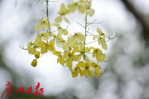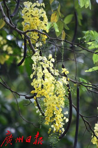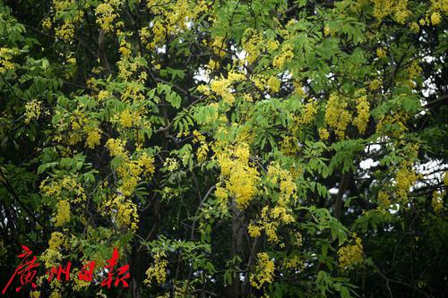 珠江公园的南门有几棵腊肠树,此时花开正盛,满树金黄。花序随风摇曳,花瓣随风而如雨落,恰如下了一场“黄金雨”。腊肠树是豆科腊肠树属植物,高可达15米,花期是6到8月。