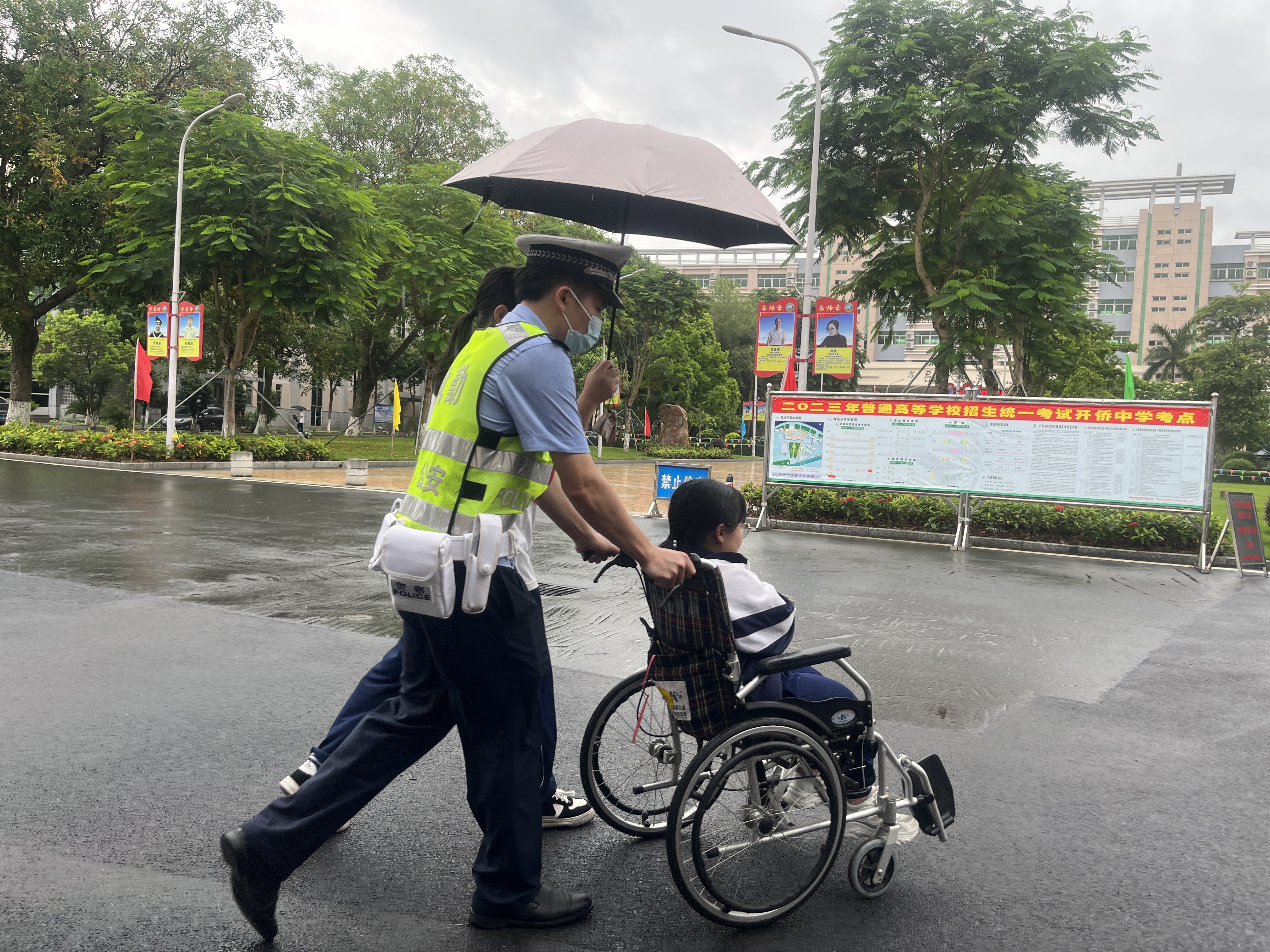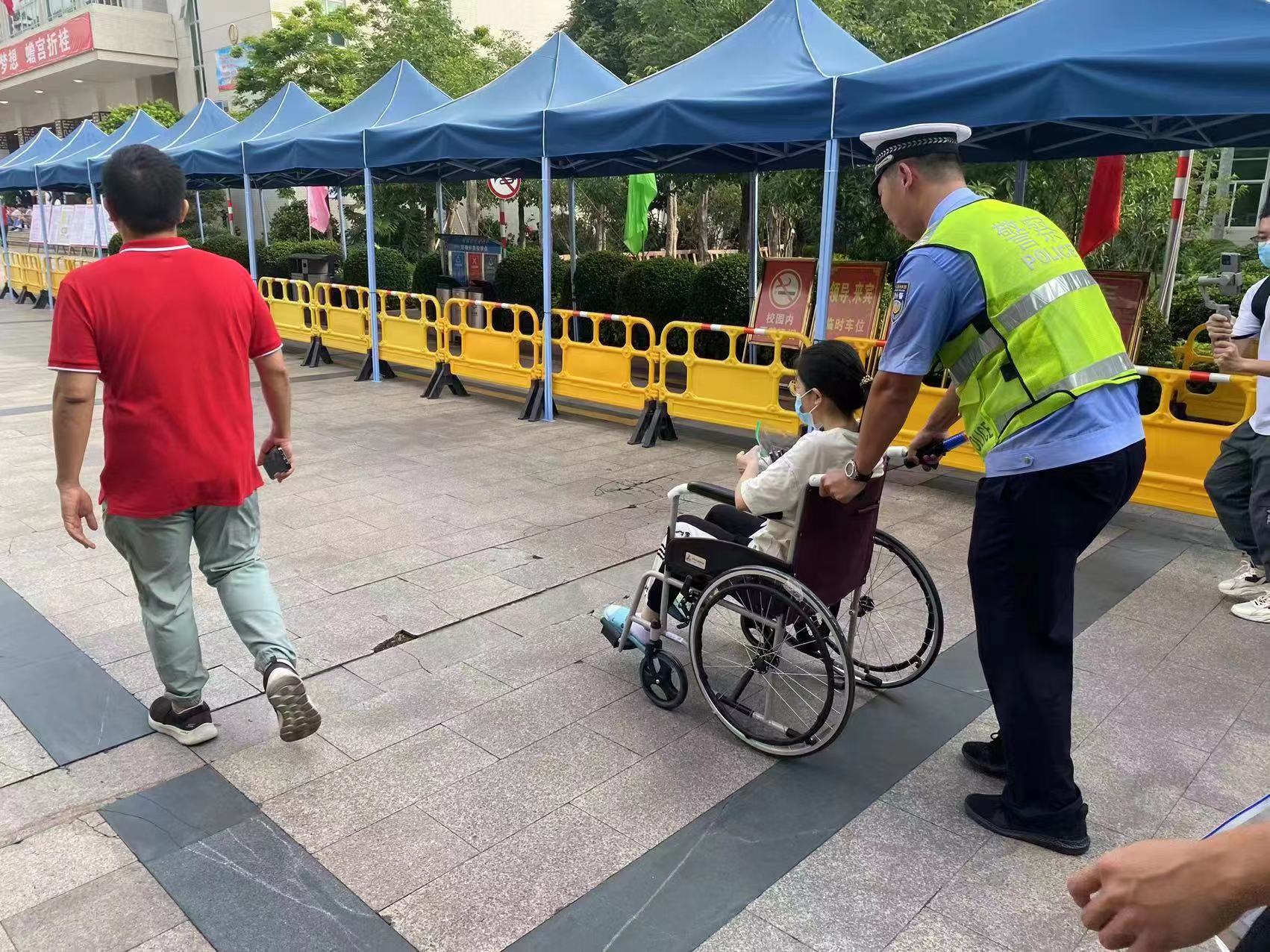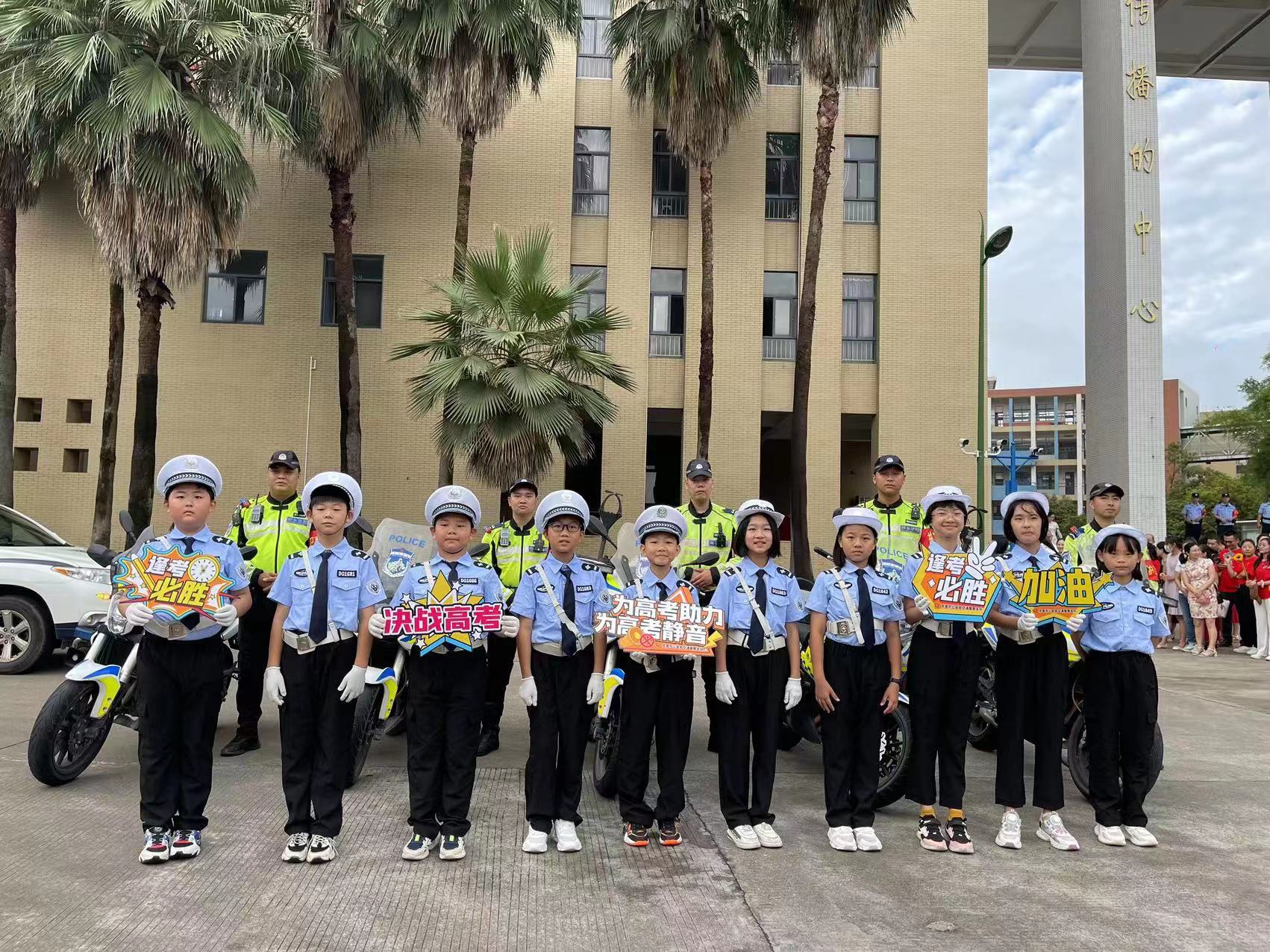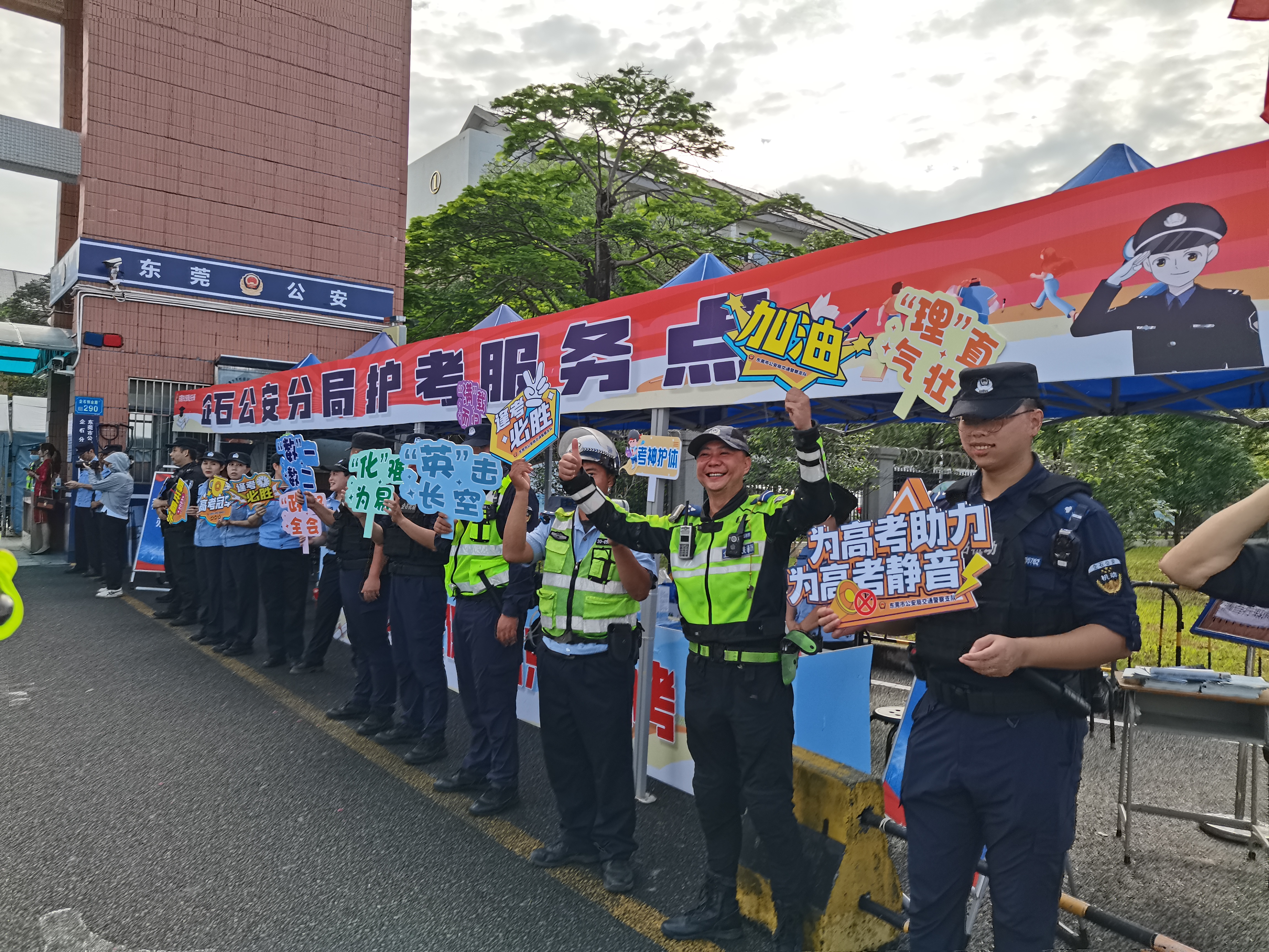 东莞市石竹实验学校的少年交警队员也为到场考生加油打气,