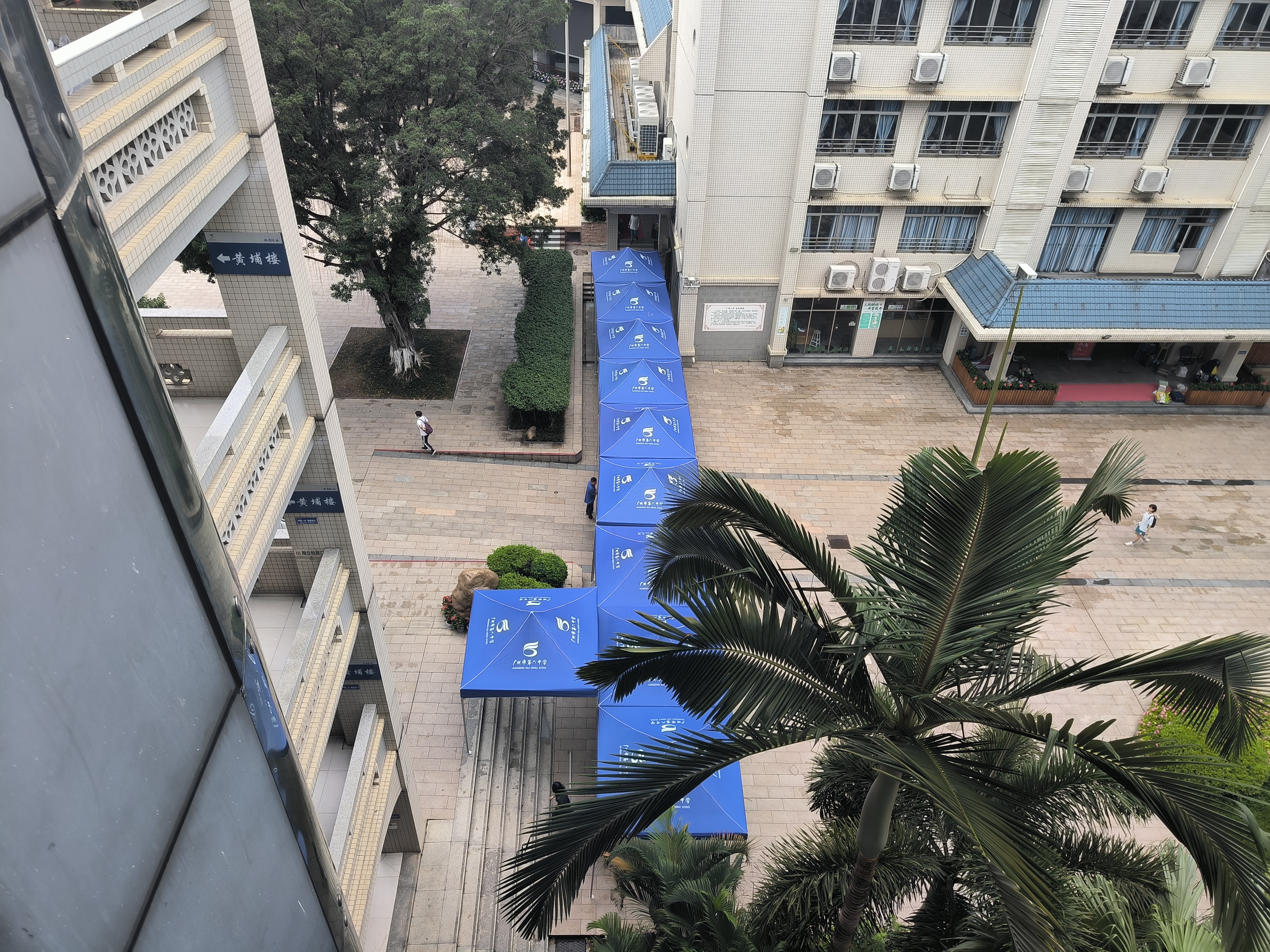 广州市第六中学考点在考场与候考室之间为考生搭建雨棚,