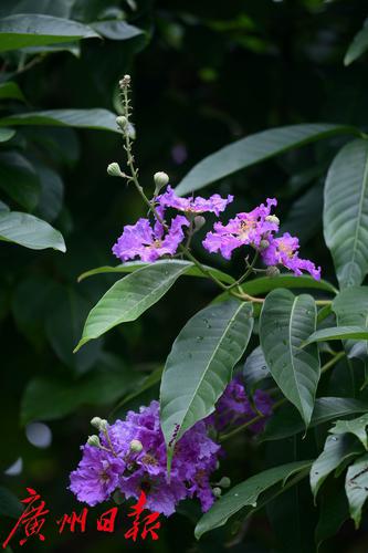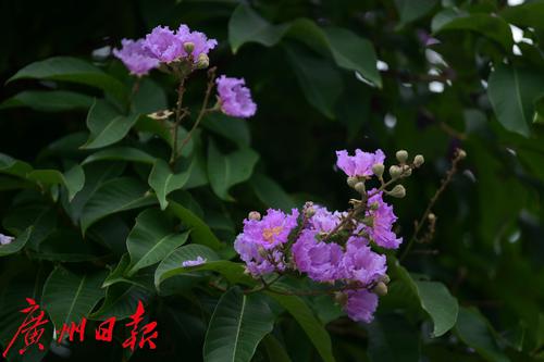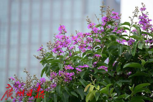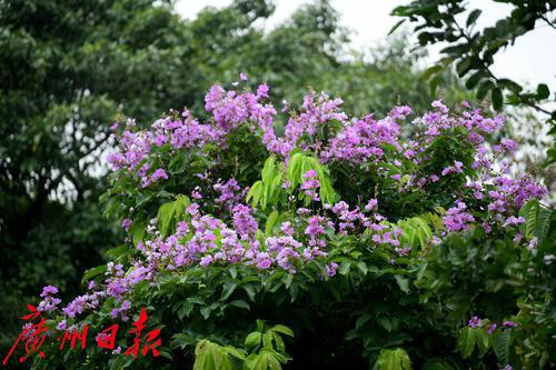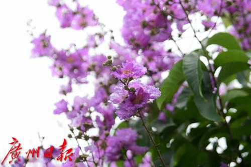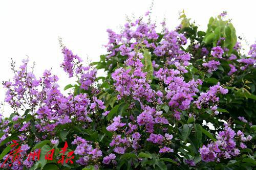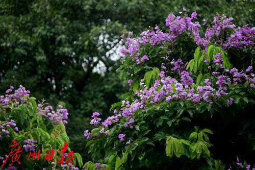 广州市儿童公园大草坪边上的几棵大花紫薇纷纷开花了,紫色的花在一片绿植及青草地之间格外显眼。大花紫薇是千屈菜科紫薇属乔木植物,花期5-7月,如今广州的大花紫薇已进入了盛花期,不少地方均可观赏。