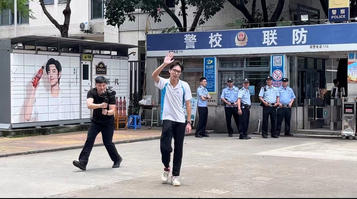 在顺德一中考点,高三(13)班的陈诺第一个激动小跑出考点,伴随这份激动的,还有一旁校友、送考家长打气欢呼声。