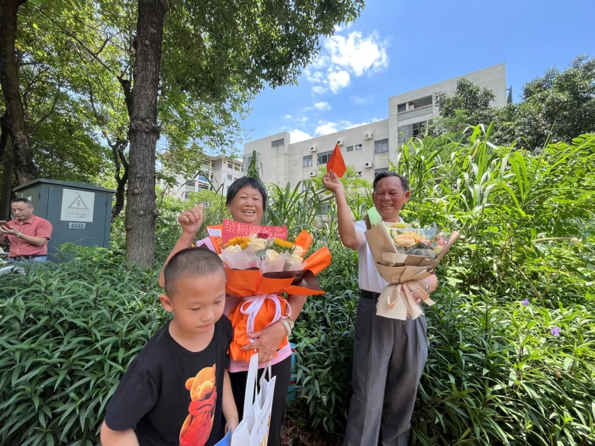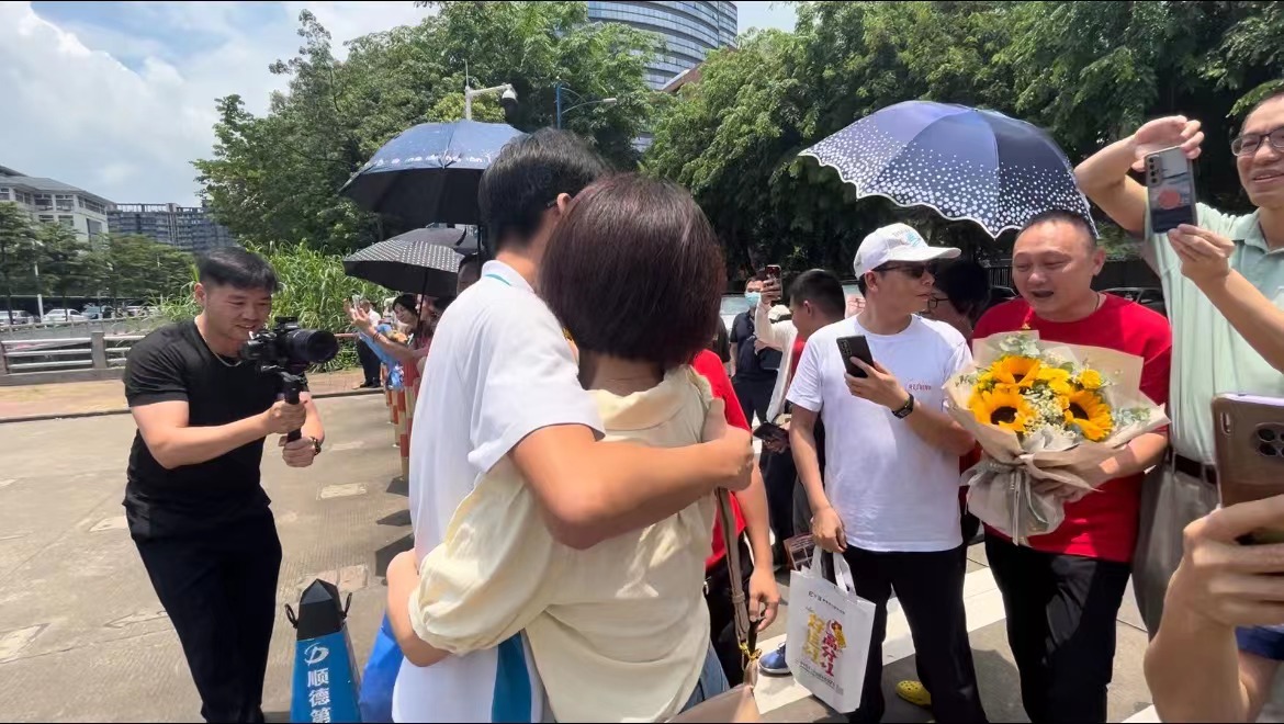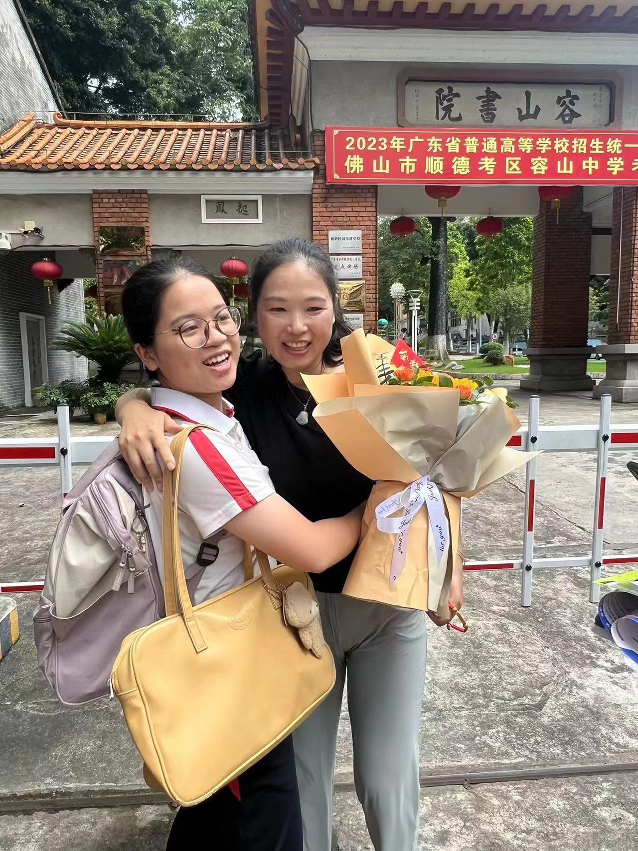 而在顺德区容山中学考点门口,妈妈“加油团”手捧鲜花等待孩子结束考试。现场,有考生与送考家长激情相拥,十分动人。