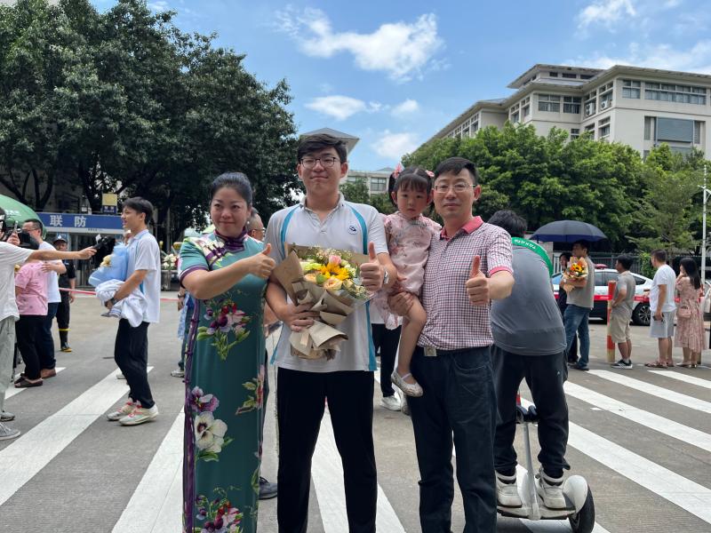 在一旁迎接施一凡的母亲也激动哭泣,和儿子激情相拥。据悉,为了给孩子送上祝福,其母亲穿上颜色鲜艳的旗袍,特意买上一束鲜花,送给走出考场的儿子。