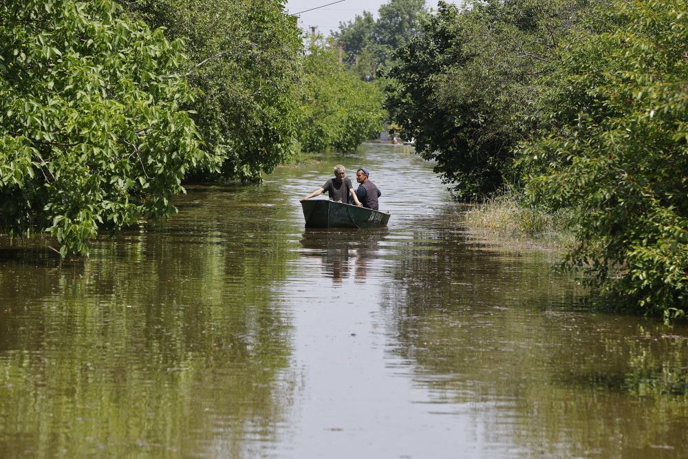 6月8日,人们乘船经过赫尔松州被洪水淹没的地区。(新华社发,维克托摄)