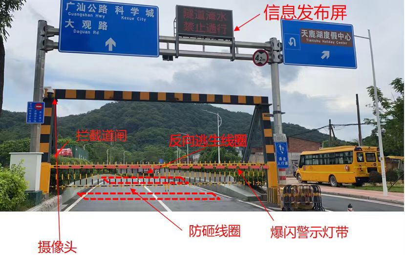 在汇星路隧道口,黄色的道闸立在道路两旁,当隧道内水位超过27cm时,道闸将自动落下,与此同时,隧道口的显示屏也会出现“隧道淹水、禁止通行”的提示,并发出警鸣声。这是广州涵隧防内涝智能管控系统的一个缩影。广东地处沿海、汛期较长,极端强降水概率大。而下沉式隧道、涵洞具有内涝水浸风险。如何将危险拦截在涵隧之外,守护人民群众的生命财产安全?