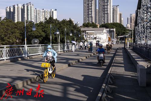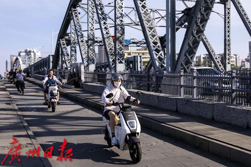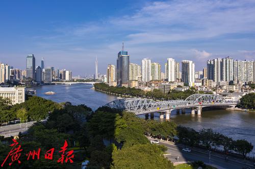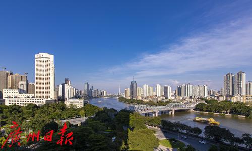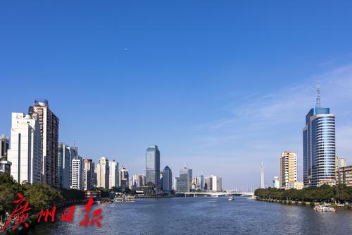 蓝天白云的好天气,珠江水面都被蓝天“染”成蓝色,海珠桥一带风景秀丽。
