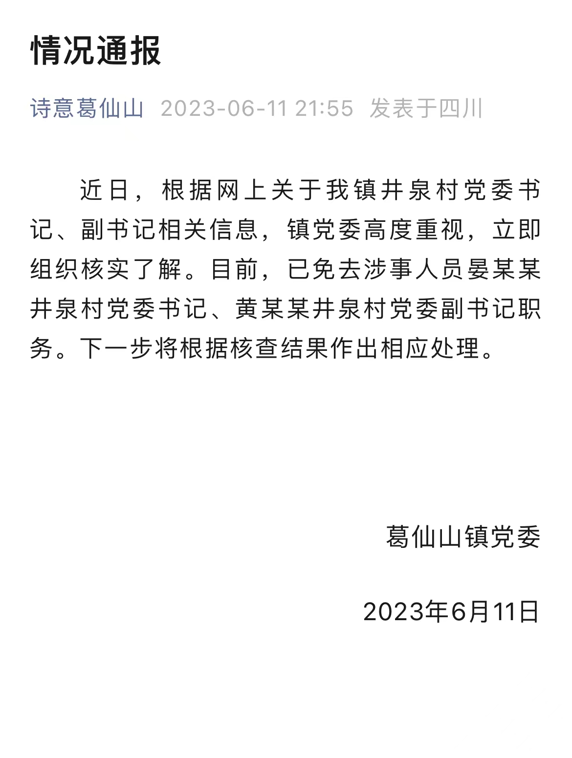 近日,四川彭州一男子自曝村副书记妻子出轨书记引关注。葛仙山镇党委11日发布通报:已免去涉事人员职务,下一步将根据核查结果作出相应处理。