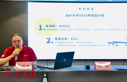 6月12日,汕头大学在广州举行本科招生媒体见面会,介绍学校2023年本科招生情况。汕大2023年本科生招生计划拟定为4600人,其中广东省招生计划3653人,省外招生计划896人,高水平运动队计划5人,预留计划46人,相关计划与去年基本一致。