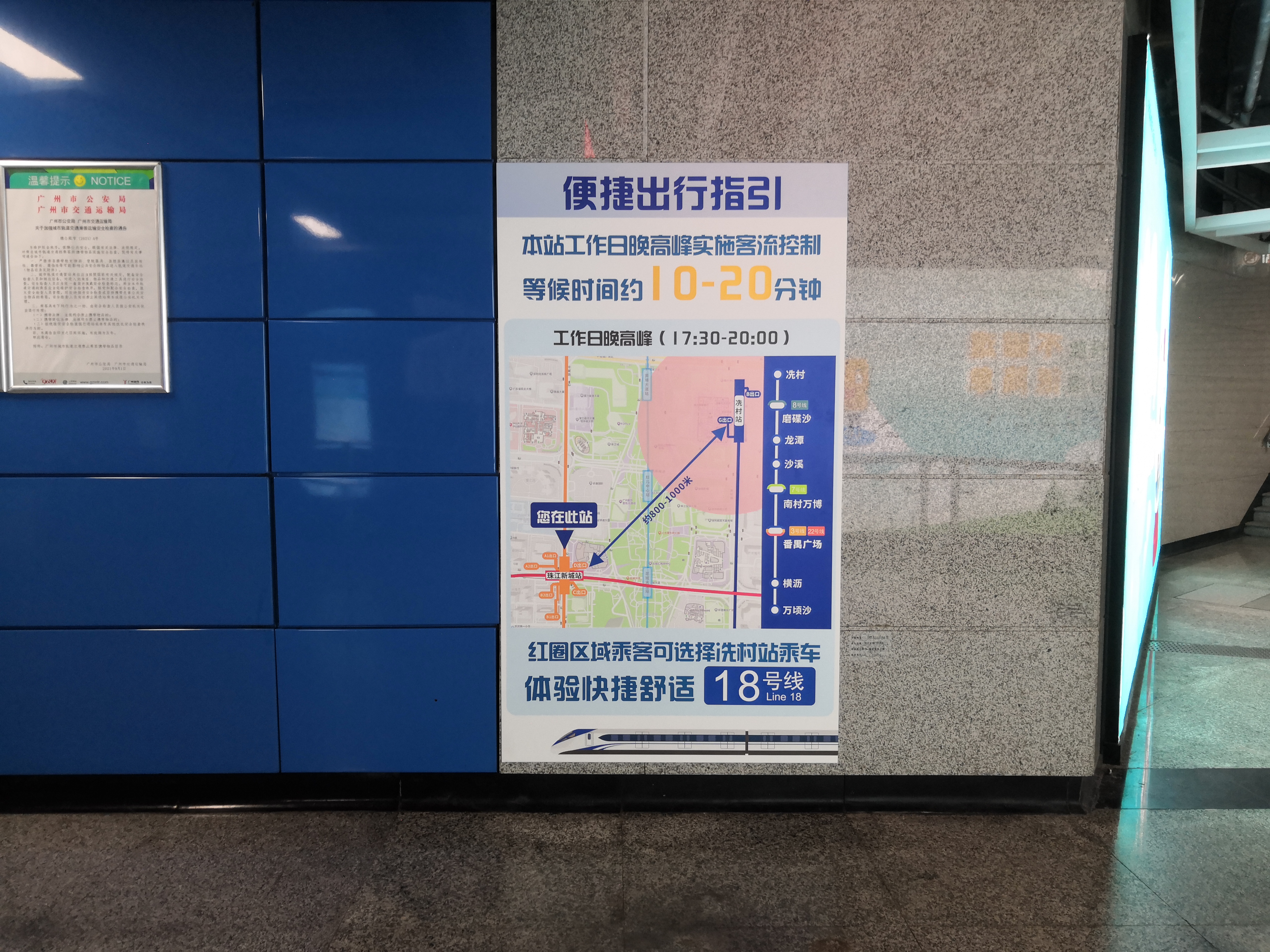 在珠江新城站,也有教大家搭18号线的指引。示意图上以18号线冼村站为圆心划出一个半径约450米的圈,圈内的乘客可以优先考虑18号线。指引特别提到,工作日晚高峰(17:30-20:00)珠江新城站实施客流控制,等候时间约10-20分钟,而18号线冼村站距离珠江新城站约800-1000米,步行过去也不远。