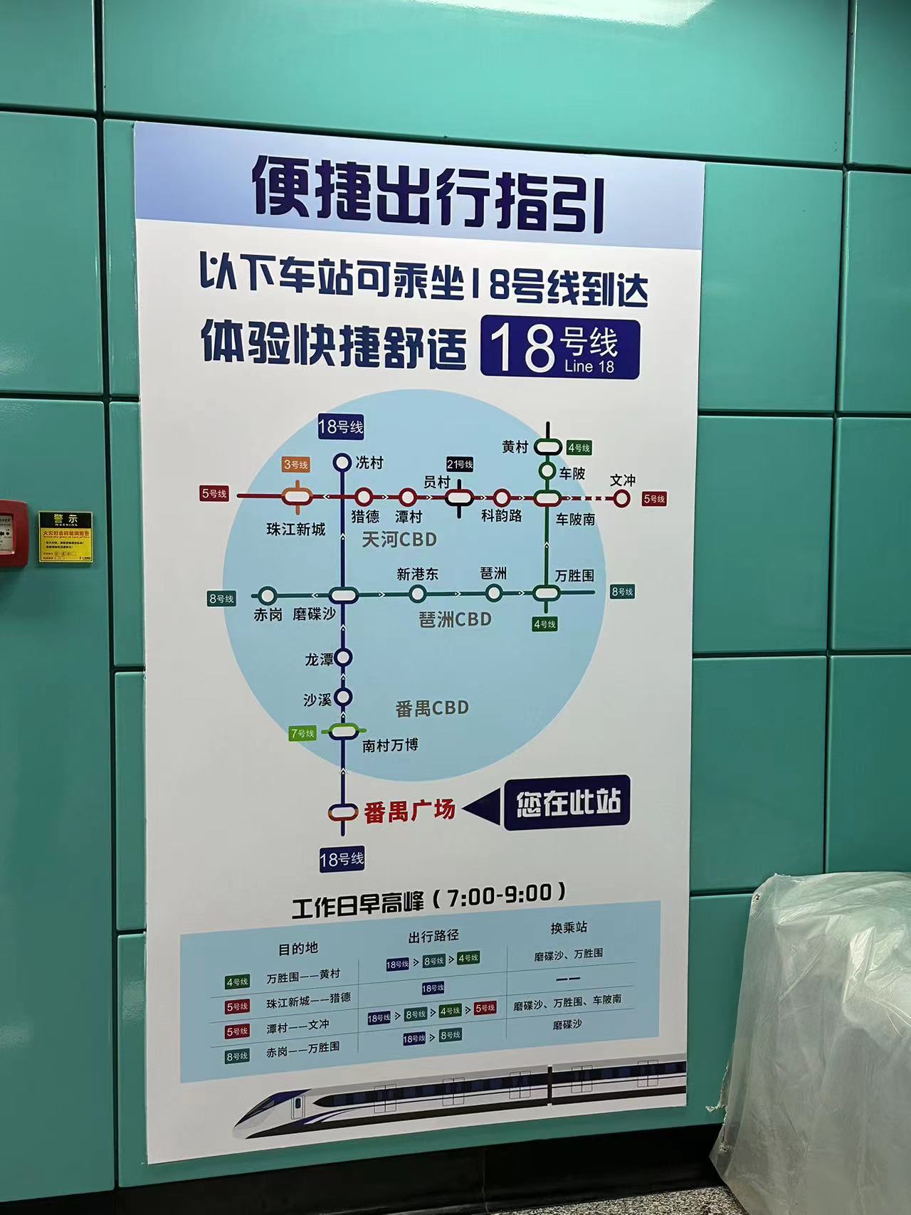 在番禺广场站搭地铁的街坊,这两天看到车站新增了一个便捷出行指引,介绍哪些目的地可以通过18号线到达,为高峰期的3号线分流。其中,目的地在珠江新城、猎德的乘客,可以搭18号线到冼村站下车前往,速度快,避免挤3号线以及在珠江新城换乘5号线;目的地在赤岗到万胜围区段的乘客,可以搭18号线转8号线抵达,在磨碟沙换乘虽然步行距离远,但比客村换乘舒适。