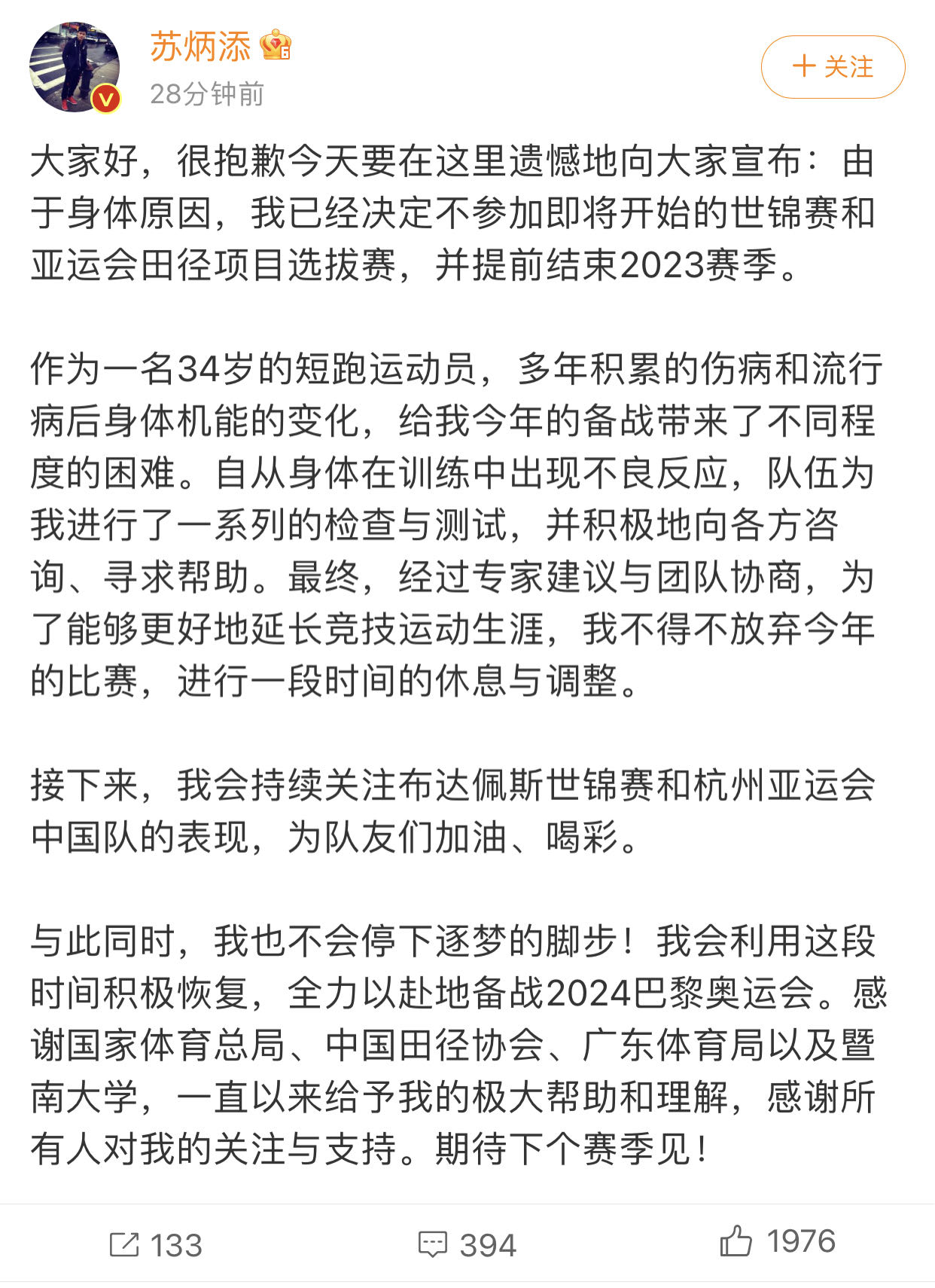 就在所有中国田径迷期待今年世锦赛和亚运会继续领略苏炳添赛场上的中国速度时,苏神本人今天突然在个人社交媒体上宣布,因身体原因,决定不参加世锦赛和亚运会田径项目选拔赛,并提前结束2023赛季。