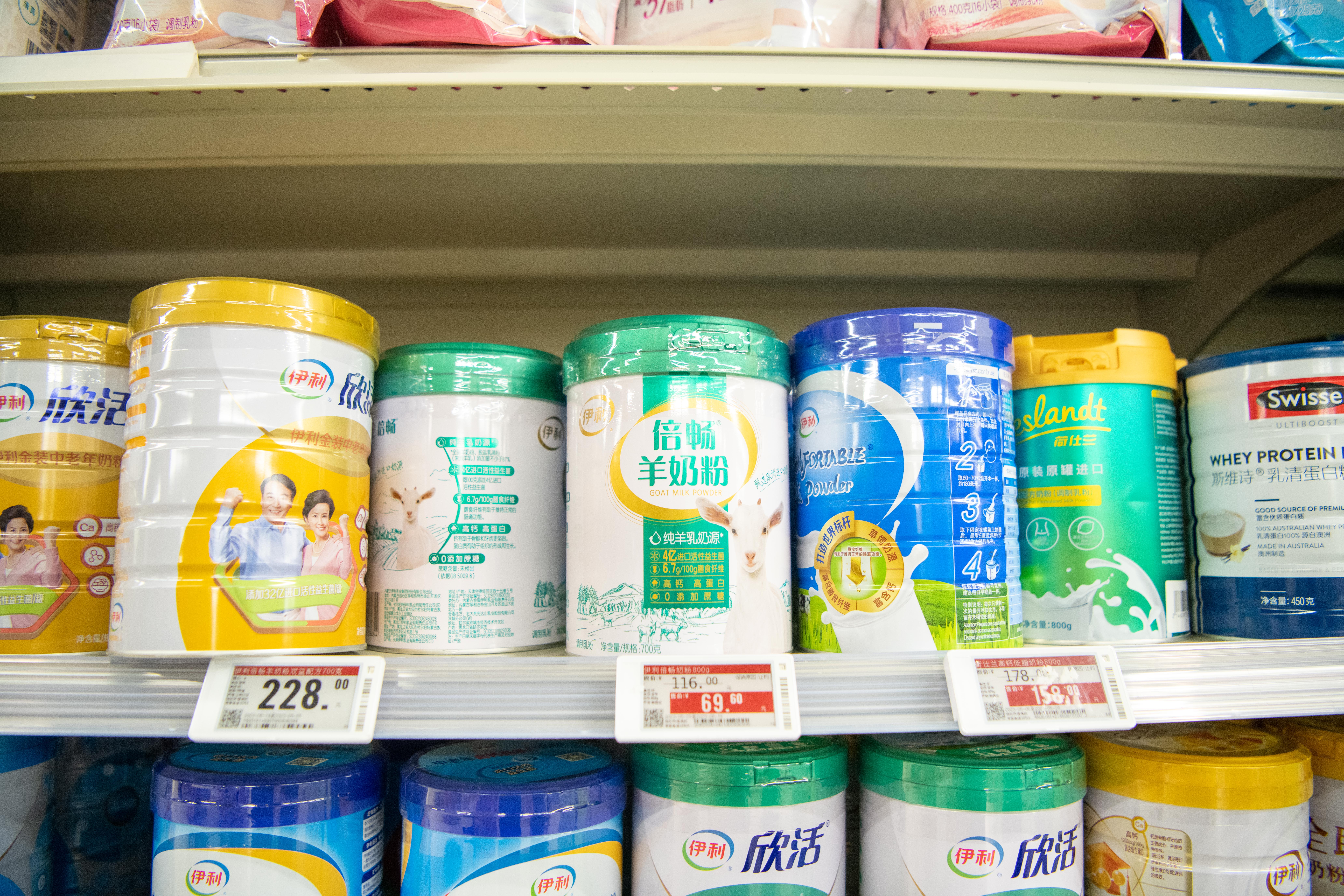 (超市货架上摆放着的羊奶粉)