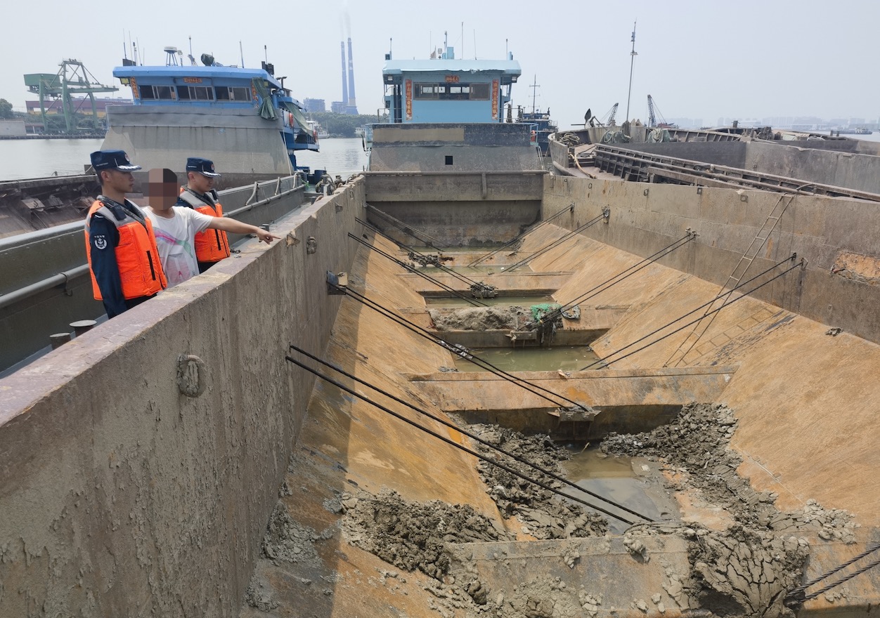 5月29日9时15分,广州海警局执法艇在辖区海域巡逻时,发现1艘抓斗船和4艘运泥船有疑似违规倾倒淤泥行为。海警执法员立即驱船靠近,通过喊话亮明身份,迅速登临检查,发现抓斗船甲板、运泥船船舱均残留有淤泥,有明显作业痕迹。