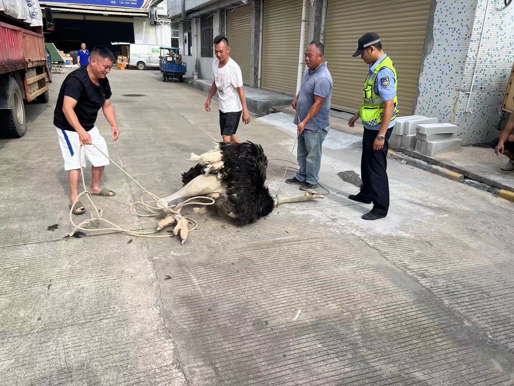 据了解,这只奔跑的鸵鸟是从中山市民众镇某农庄出走的。处理此次“鸵鸟事件”的中山市公安局开发区公安分局勤务大队蔡军杰、廖锐钊告诉记者,今天早上7:30,开发区公安分局指挥中心接到报警称:在中山港大桥民众往开发区方向发现一只驼鸟。接到报警后,蔡军杰、廖锐钊两位执勤人员立即赶赴现场。7时45分,在逸仙路东龙加油站,他们发现该驼鸟,于是一路跟着驼鸟,恐其伤人,最终将驼鸟赶至附近一工厂,并要求保安将驼鸟锁住,不让驼鸟外出。在指挥中心警员的帮助下,很快找到民众某农庄的驼鸟主人。9时左右,驼鸟交由主人带回民众镇。