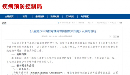为加强儿童青少年脊柱弯曲异常防控工作,国家卫生健康委疾控局组织编写了《儿童青少年脊柱弯曲异常防控技术指南》(以下简称《指南》),以指导规范、科学地开展儿童青少年脊柱弯曲异常流行病学调查、筛查及防控工作。《指南》于2021年11月1日发布。