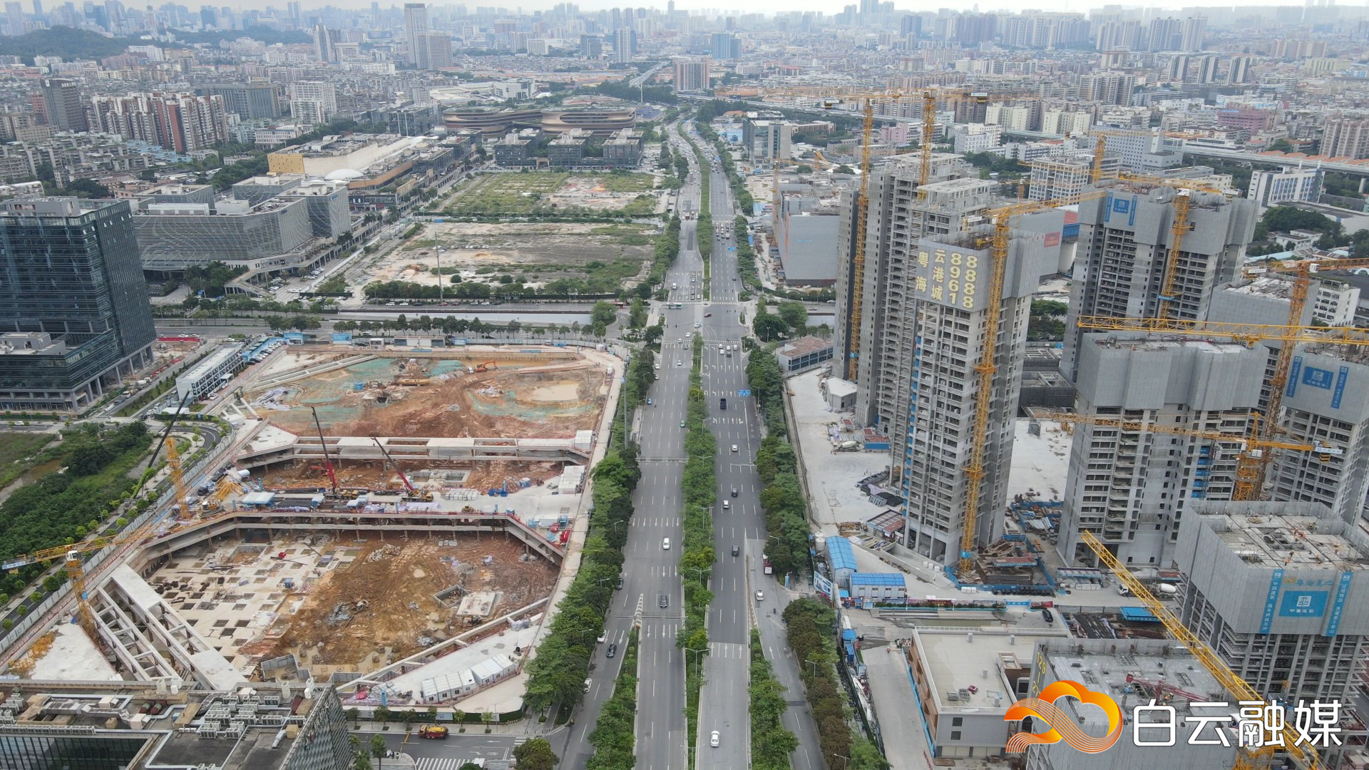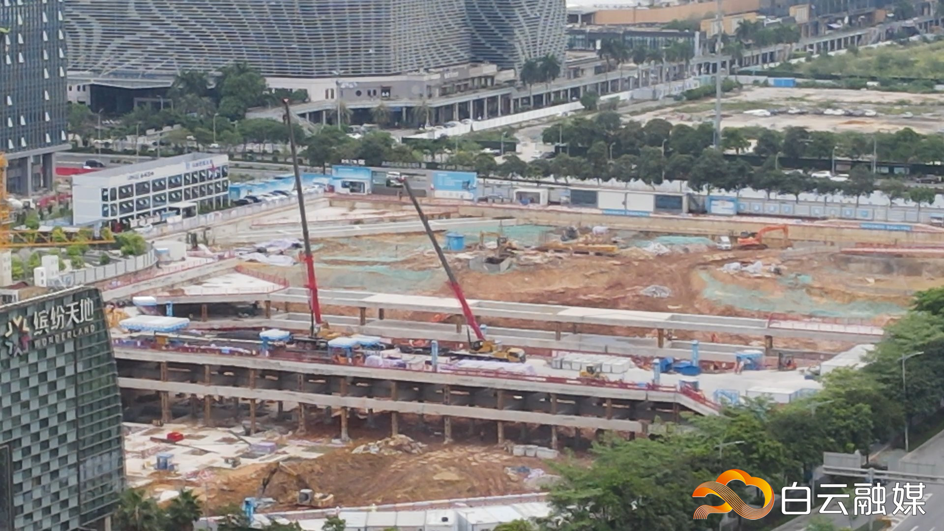 粤海云港城项目住宅及商办地块高楼拔起,写字楼组团地块正加紧地下室结构施工。