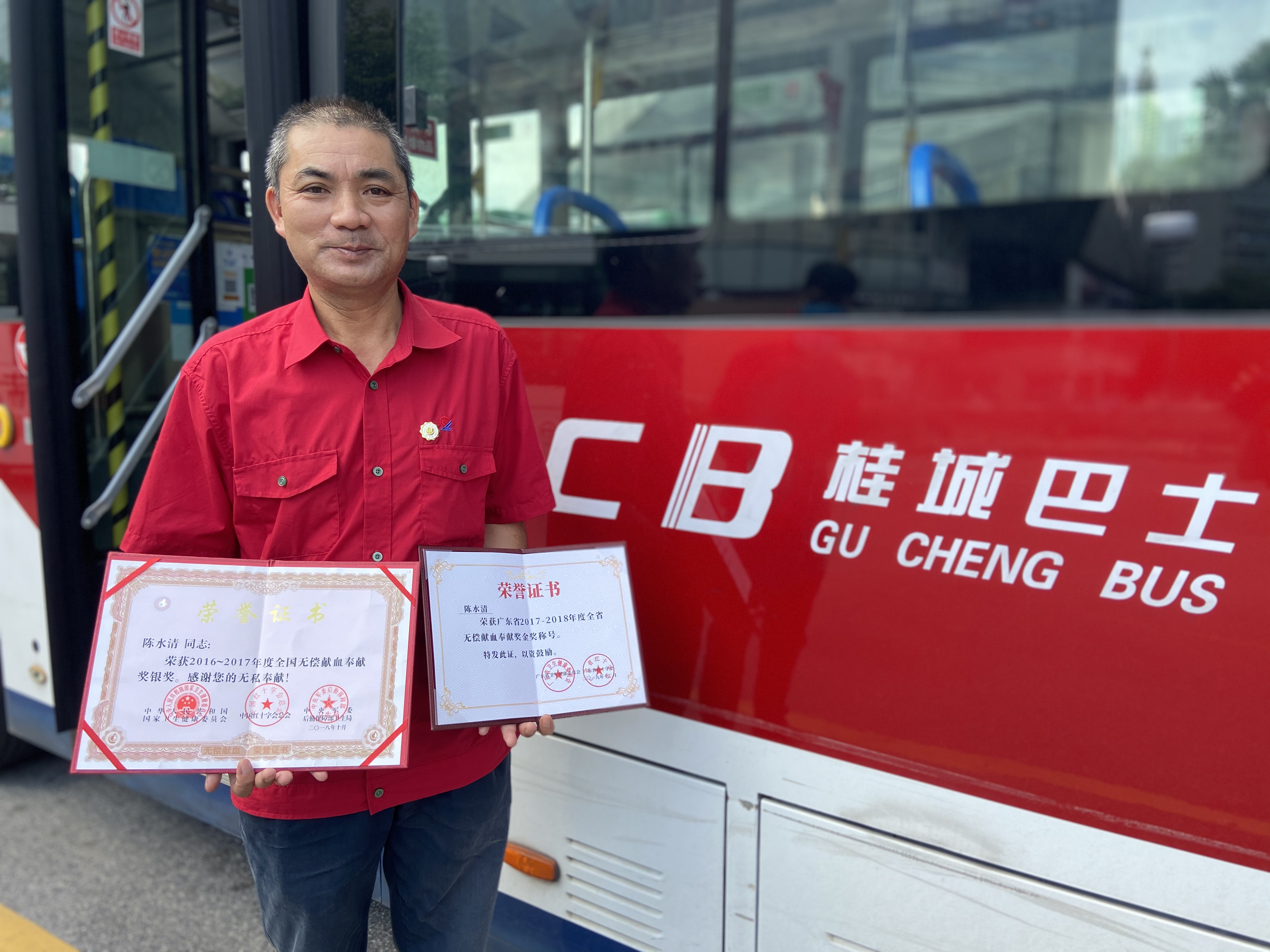6月14日是第20个“世界献血者日”。来自佛广集团桂城分公司279线的公交车长陈水清提前一天来到佛山市南海血站,完成了他人生中的第101次无偿献血。16年来,陈车长的这种热忱和无私的奉献精神,收获了大家的认可、鲜花、奖杯和掌声。