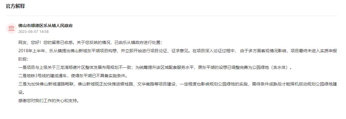 不过,网友并不满意该回复。随后,佛山市顺德区乐从镇人民政府做出解释称,2018年上半年,乐从镇提出佛山新城东平湖项目构想,并立即开始进行项目论证、征求意见。在项目深入论证过程中,由于多方面客观情况影响,项目最终未进入实质申报阶段: