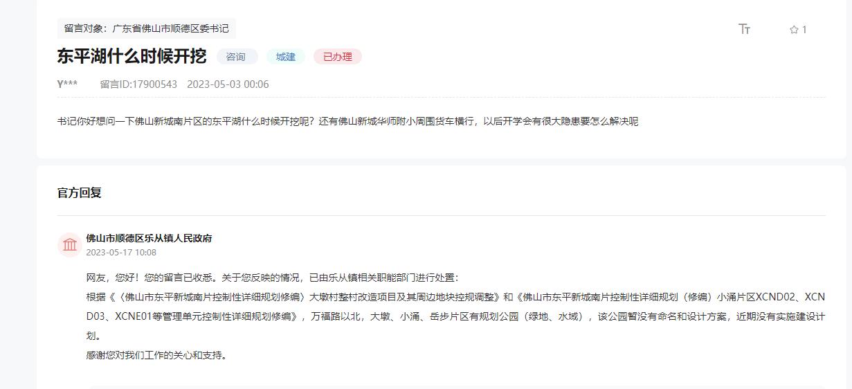 记者搜索发现,时间到了2019年3月,有网友在问政平台上咨询东平湖的进展。发言人单位佛山市顺德区乐从镇人民政府回应称,东平湖建设是乐从镇建设国家级水利风景区的核心项目之一,该项目占地广、投资大,项目实施需办理的前期手续较为繁复,现该项目已进入片区规划控规修编阶段,待控规确定后,有关部门将马上推进项目后续湖体开挖的设计施工工作。