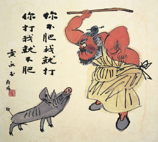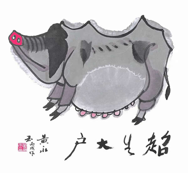 黄永玉生肖画的最大特色就是其“黄氏幽默”,他用他的具有漫画特点的形象构成,他用他的题语,以文与图的相得益彰的配合,往往令人拍案叫绝——“他真的想得出来”——人们经常会这样感叹这位可爱的老头所特有的鬼才。