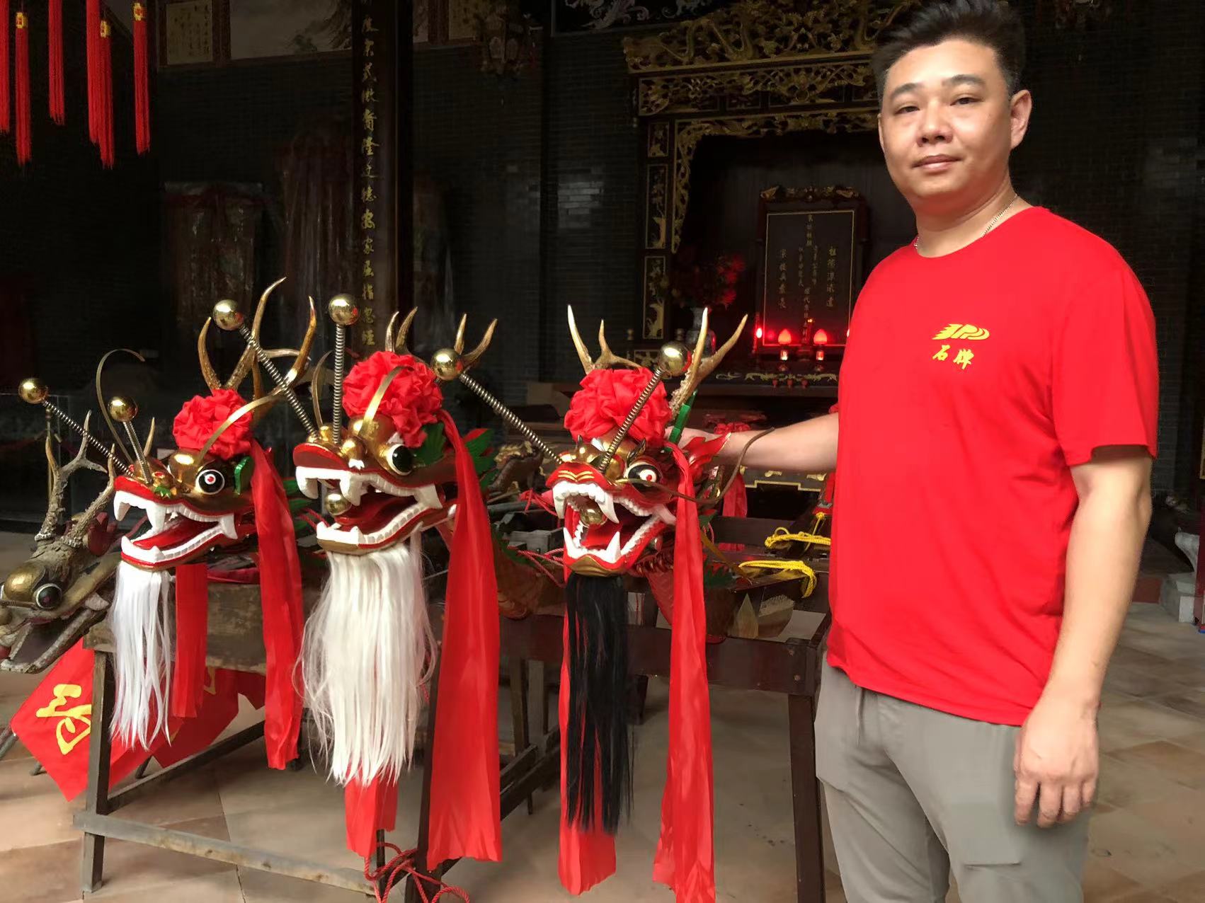 石牌三骏企业集团董事董炜炬告诉记者,2019年参加过广州国际龙舟邀请赛,年轻一辈的龙舟爱好者希望制作一条轻快的龙舟,能够在大赛中赛龙夺锦、获得优胜的龙舟,“材质上我们选择更为轻巧的杉木,龙头则请黄埔区‘龙舟龙头、龙尾制作’技艺非遗传承人张伟潮操刀制作,乡亲们一起参与了这个龙头的设计制作,提出很多宝贵的意见和建议,经过长达半年的反复修改,最终定稿,龙的眼睛、胡须、鳞片、毛发更加立体,增加了渔网纹、如意,龙角采用左右完全对称的鹿角,嘴唇设计出尖尖的形状,寓意丰衣足食、吉祥如意……”这个龙头融入了很多石牌村居民的生活、生产和文化元素,活灵活现,栩栩如生,立体感强,接地气,因此被冬奥会开幕式导演组选中。